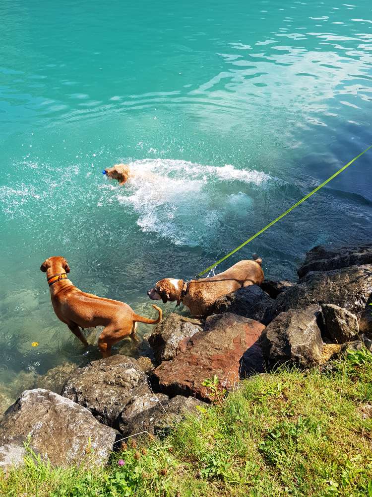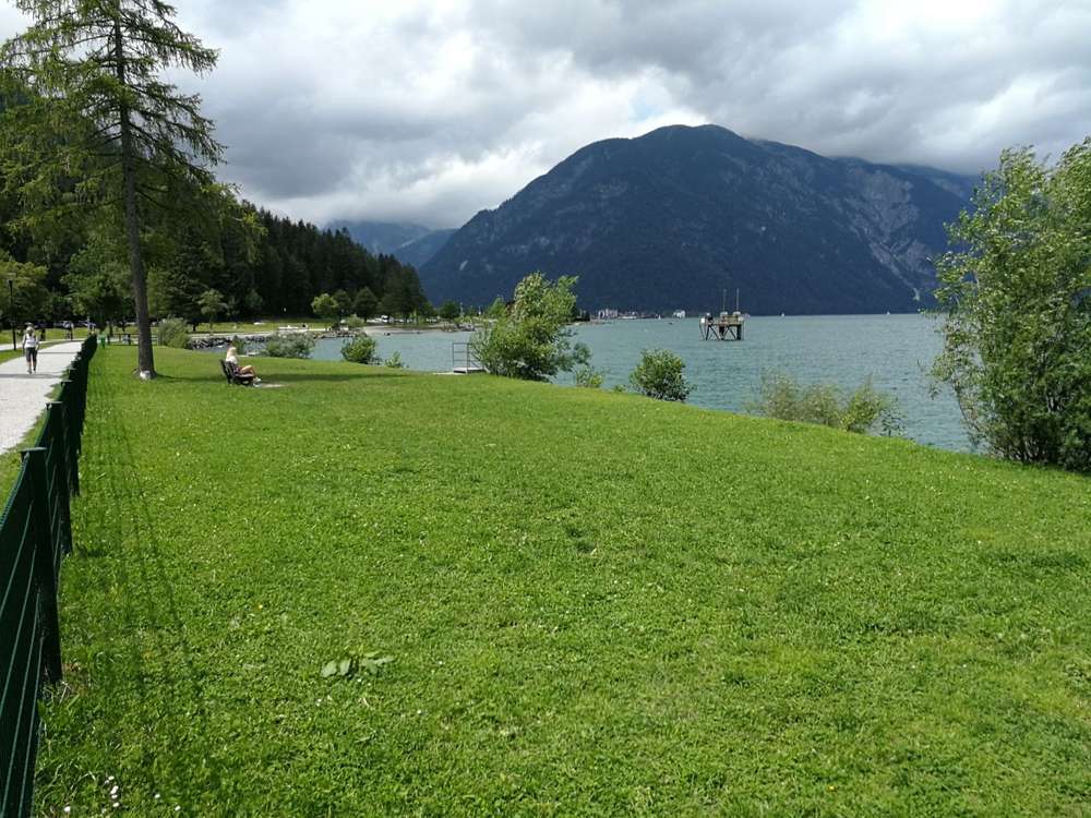 Hundesteand Achensee eine schöne Sache, damit Hunde ungestört im und am Wasser spielen können.Leider sehr steinig und steil, nur zwei Metalltreppen, die ins Wasser führn.Nichts für Angsthunde, da gleich tief ins Wasser rein.Komplett eingezäunt, mit Möglichkeit Kotbeutel loszuwerden.Wiese allerdings voll in der Sonne, kaum Schattenplätze.Also immer einen Schirm mitnehmen.Hunde können frei laufen, aber natürlich sollte auch hier die Aufsicht gewahrt werden, falls sich welche nich so mögen....