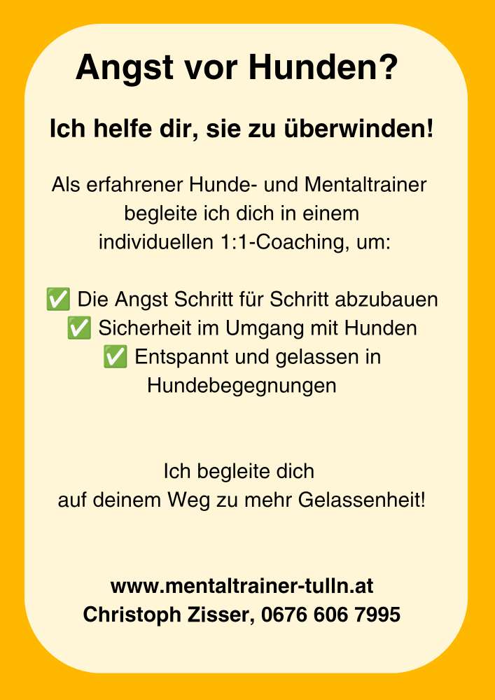 Ich bin diplomierter Hundetrainer und zertifizierter Mentaltrainer und biete Hund-Mensch-Coachings an.