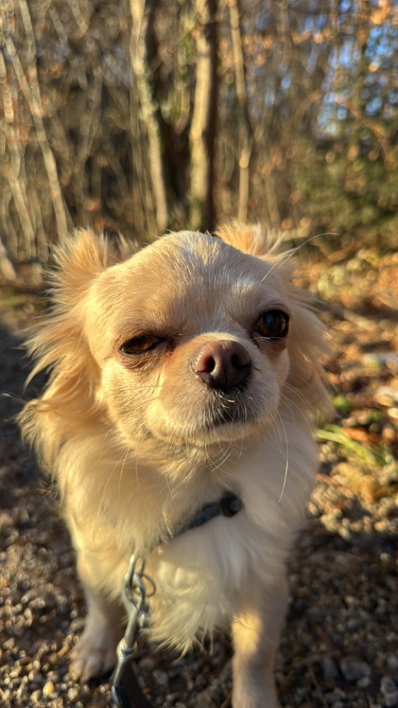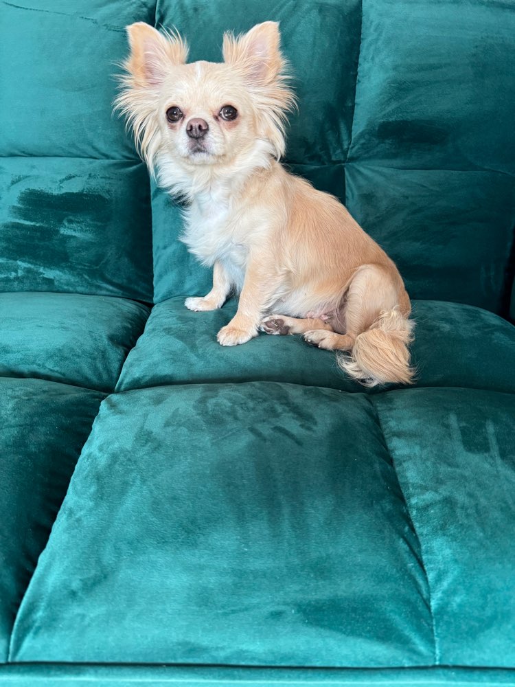 Lou ist ein Chihuahua Langhaar Farbe Creme 25cm Schulterhöhe.