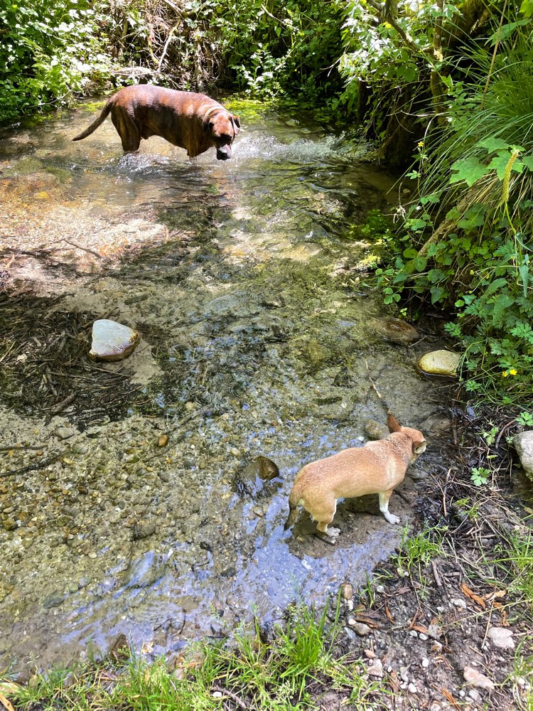 Ein schönes Wald mit vielen kleinen Bächlein und Bademöglichkeit für Hunde.