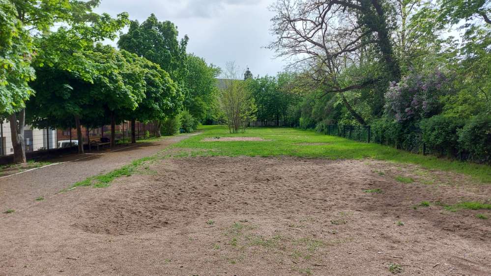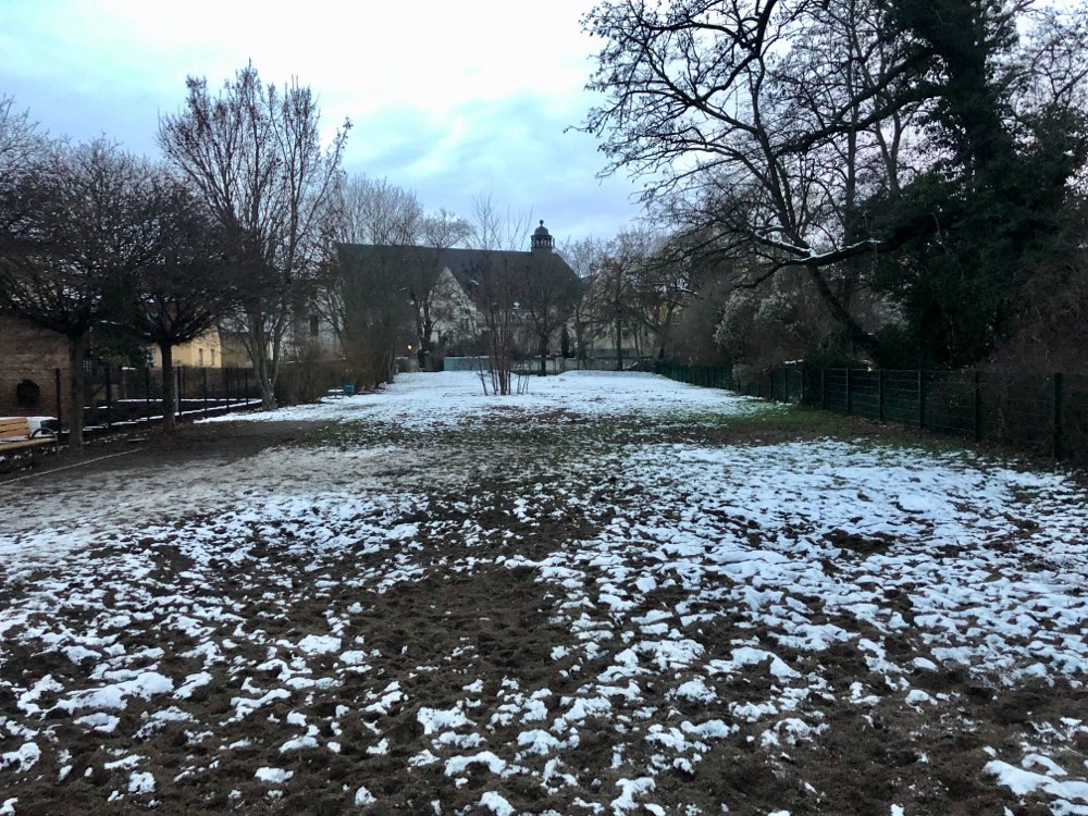 Eingezäunter Hundeplatz in der Augustapromenade mit mehreren Bänken und Mülleimer. Ein paar Bäume, hauptsächlich freie Fläche. Der Zaun ist hoch genug für größere Hunde und die Anlage wirkt insgesamt gepflegt.