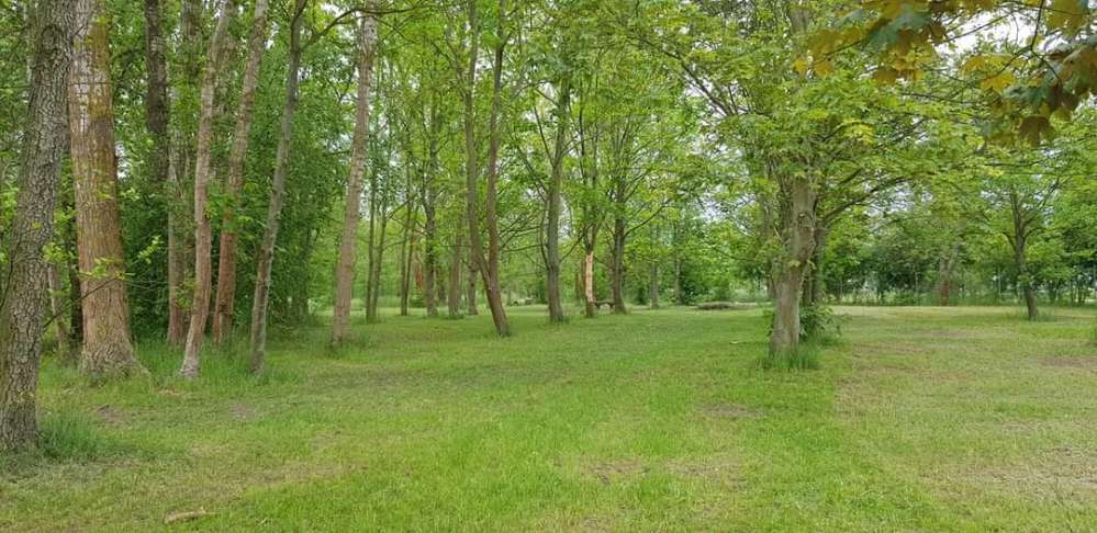 Eingezäunter und gepflegter Hundepark in Schwedt. Vor der Tür befindet sich eine Mülltonne samt Kotbeutelspender.