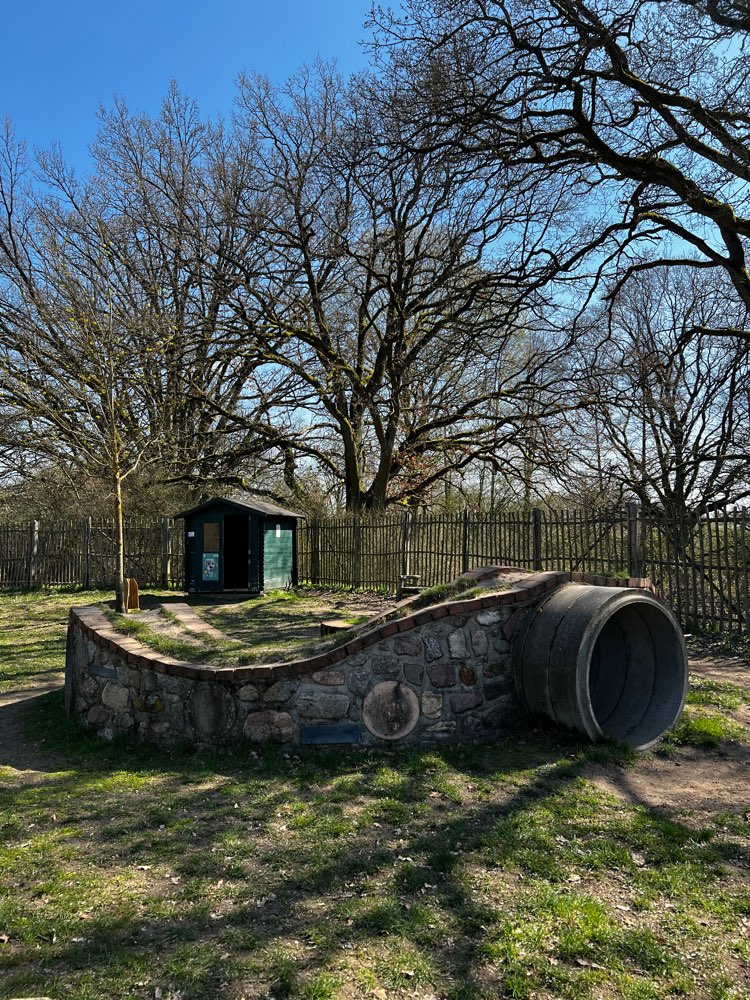 Klein aber schön gemacht, Tunnelröhre/ kl.Hügel, Slalomstangen usw. Zutritt über eine Art "Schleuse" (Doppelgatter, um Weglaufen zu verhindern)