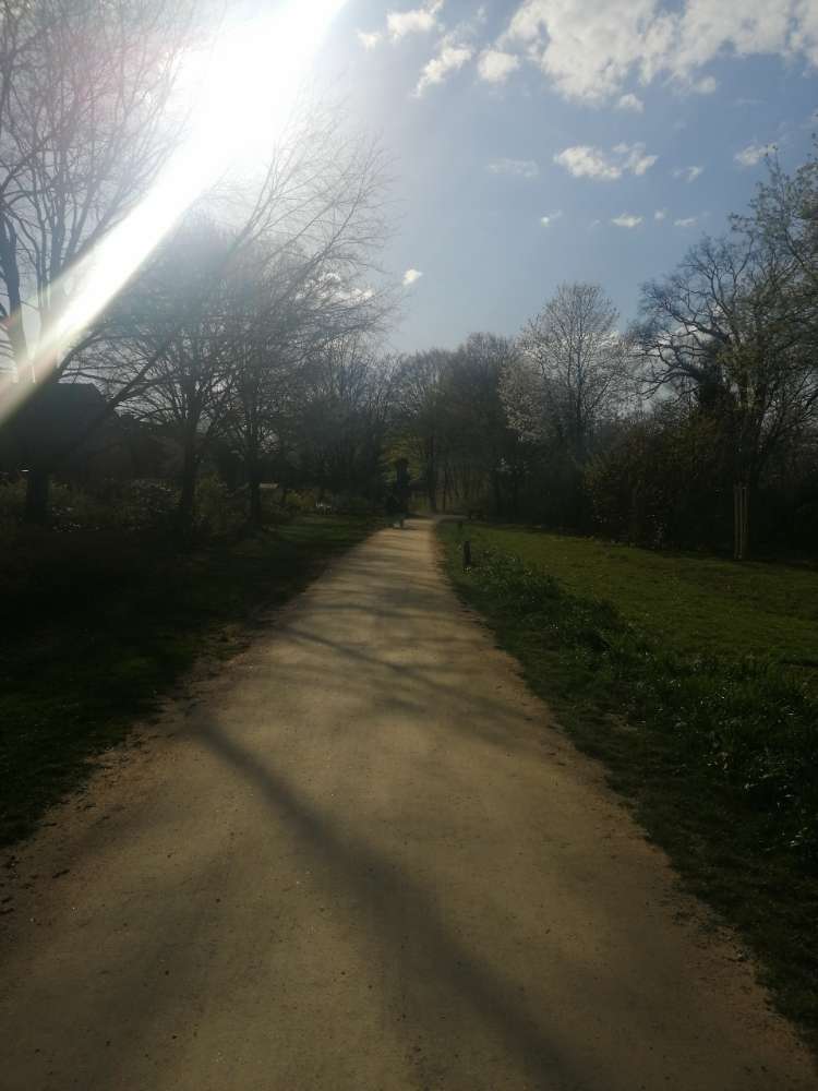 Kleiner Park mit vielen Mülleimern und Sitzgelegenheiten.