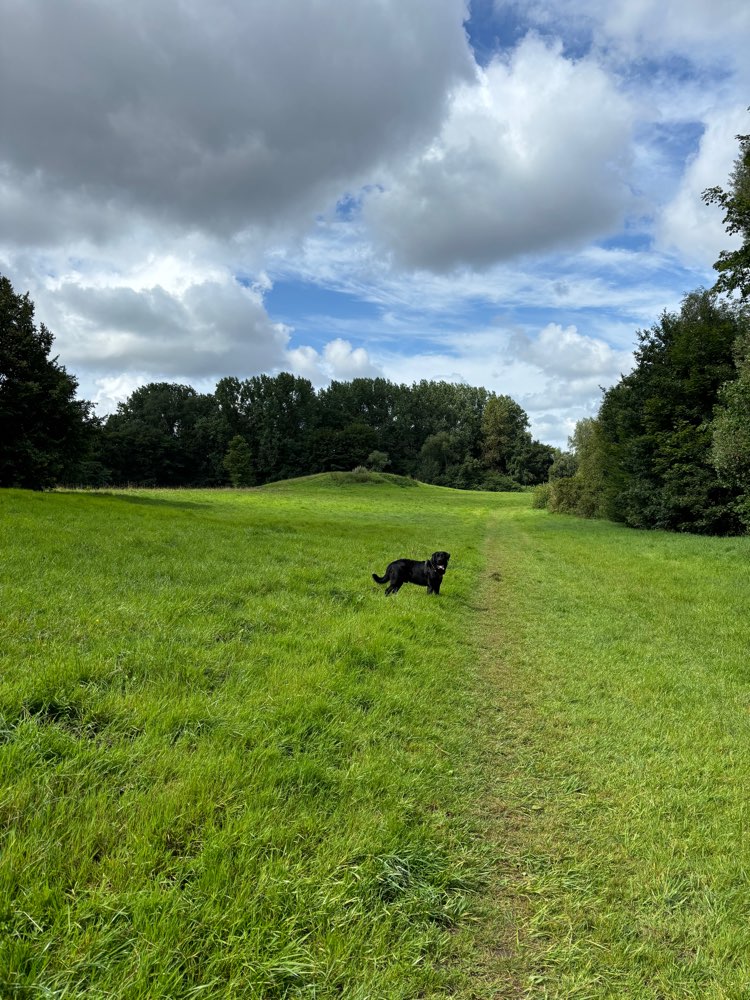 tolle große Auslauffläche ohne Leinepflicht, leicht hügelig und bewaldet mit einem kleinen Bach (toll) und einem Tümpel (naja)