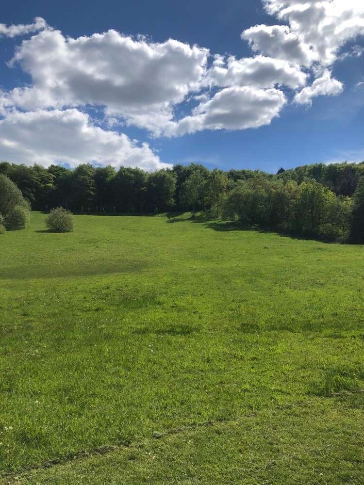 Sehr ruhig gelegene, riesige Wiese, die in einer Senke liegt. Drumherum ist Wald von dem aus man von oben einen Blick auf die Wiese hat.