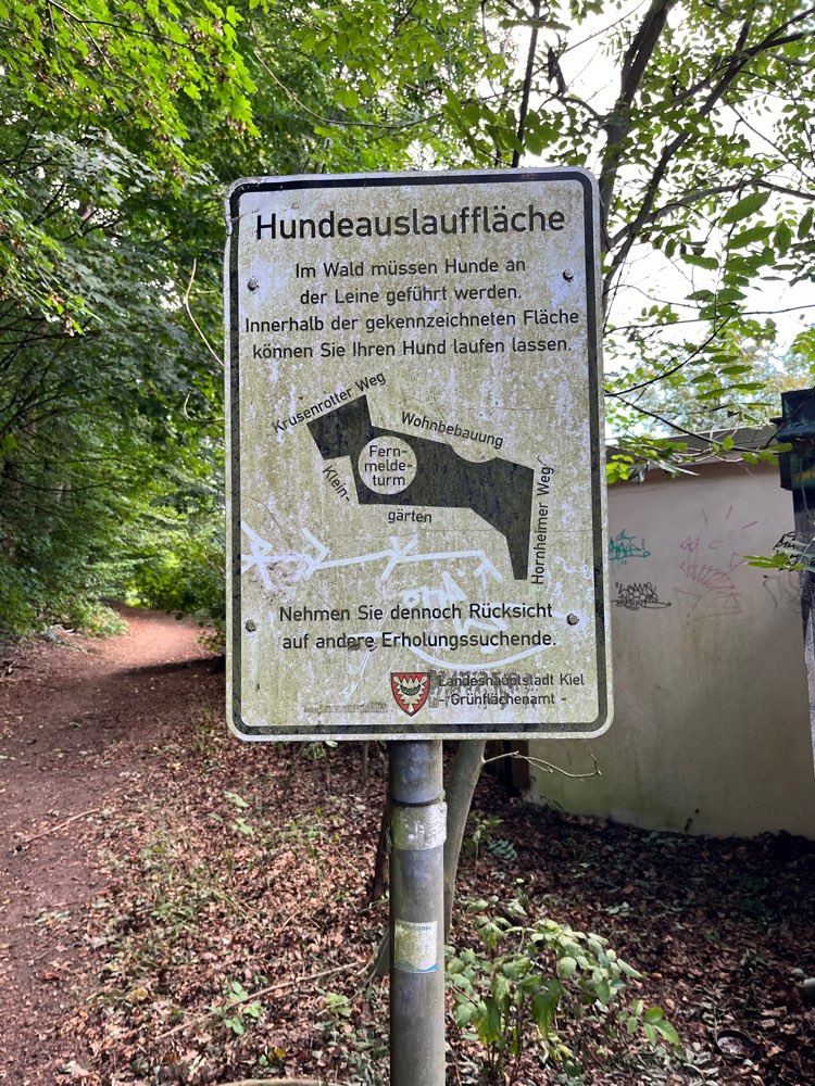 Das Schild mit der Beschreibung der Auslauffläche fanden wir etwas irreführend, denn der Freilauf ist ja im Wald. Doch es sind wirklich sehr nette Hundebesitzer unterwegs, also mal eben nachfragen: und es Freilauf genau die Fläche im Wald, welche dunkel dargestellt ist.