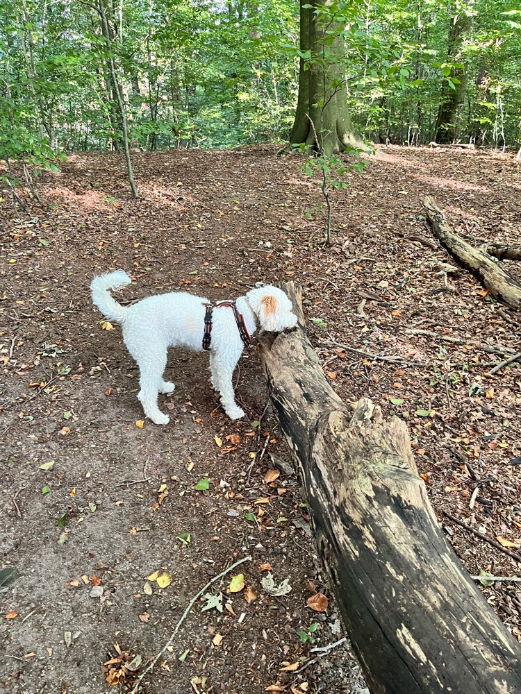 Zwar gibt es keine Einzäunung, trotzdem ziehe ich keine Pfote ab. Es ist so schön denn Hund dort laufen zu lassen. Der Wald ist nicht zu dicht, das Unterholz super „aufgeräumt“, und trotzdem liegen noch Baumstämme rum, zum klettern oder Leckerli verstecken und suchen etc.