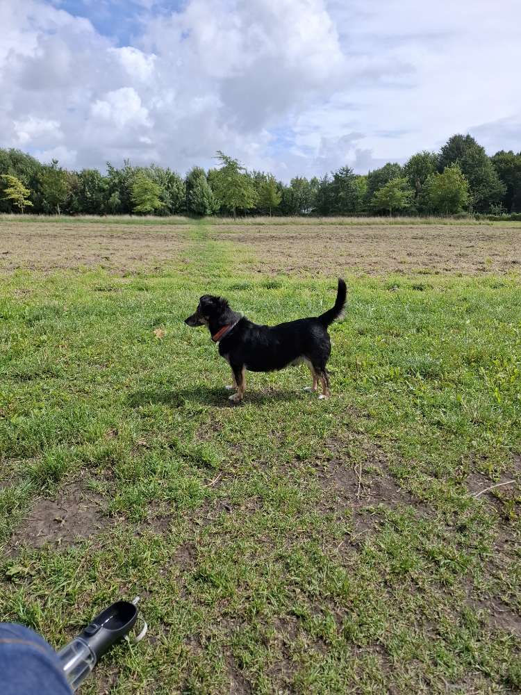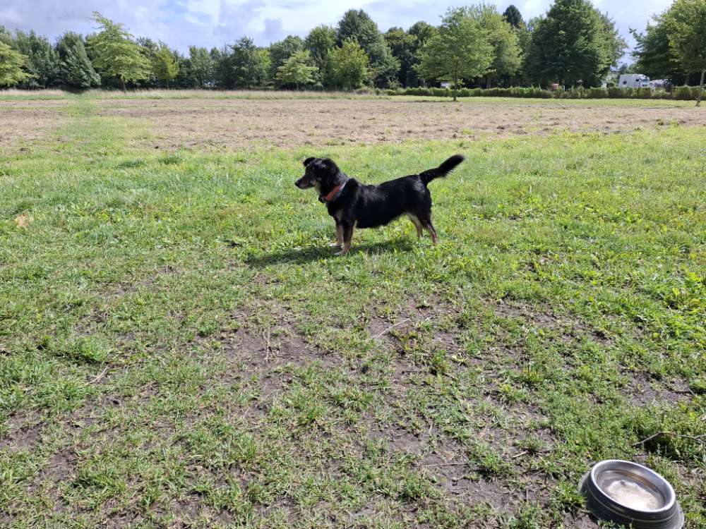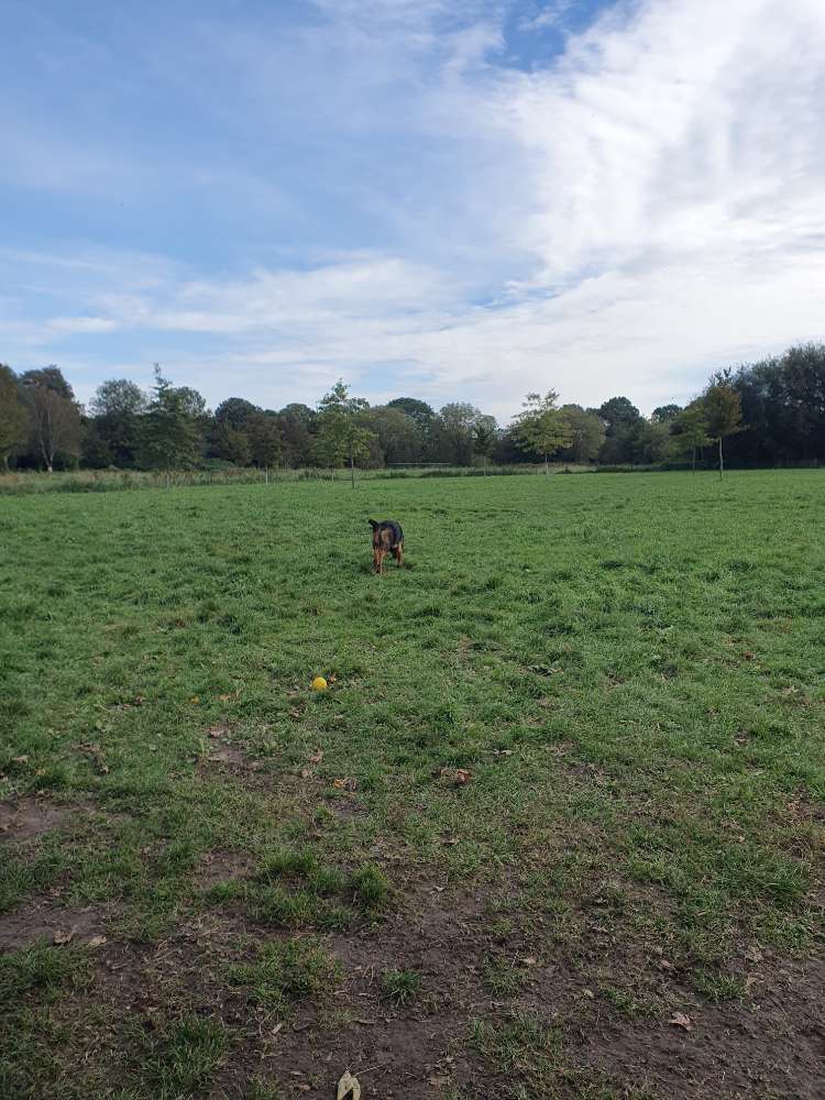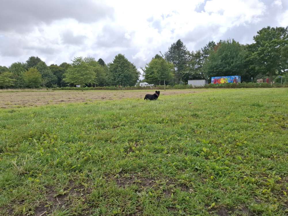Großzügige Wiese als Freilauf, komplett umzäunt (ca.90cm), extra Eingang zum Ableinen. Ein paar Bäume, Wasserlöcher vom Regen als Goodie 😉 und viiiel Platz zum rennen, buddeln und toben. Bänke, Beutel und Mülleimer vorhanden, sogar Wassernäpfe.