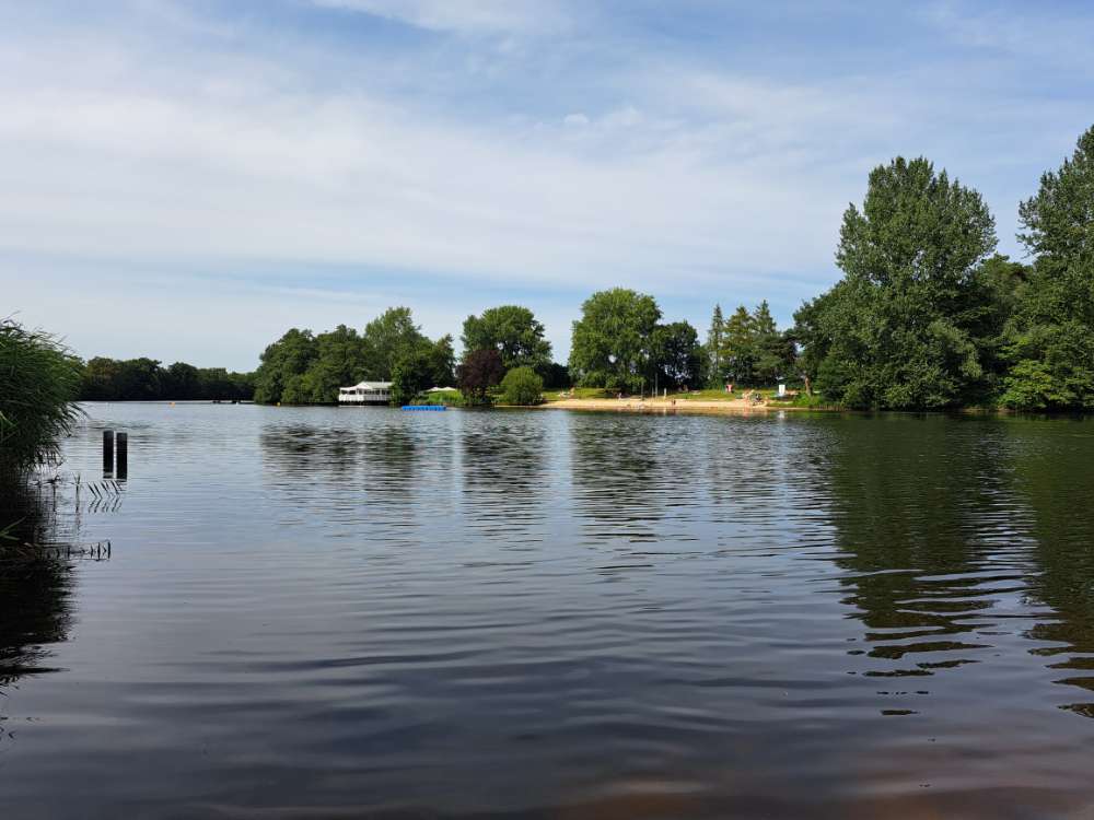 Das ist ein Naturfreibad. Wenn einmal rund läuft ( 1,3 Km ), hat man auch Stellen, an denen Hunde baden ( chwimmen) können. Nur schade, dass das Café für Hunde nicht zugänglich ist.