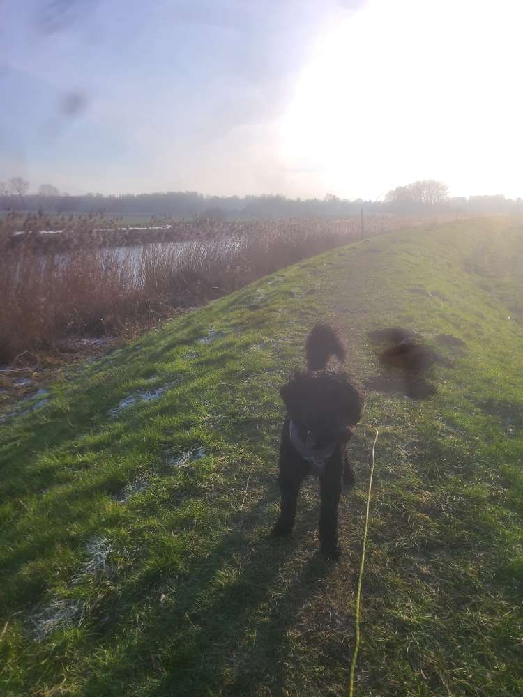 Der Weg am Deich ist sehr schön. Man kann unten oder oben lang laufen. Das mit der aufgesetzten Leinenpflicht stimmt so nicht. Die gibt es auf dem Gelände und ist auch ausgeschildert. Da dort wohl auch manchmal Schafe stehen macht das auch sinnvoll. Ansonsten ein schöner weg für eine übersichtliche runde. Auf dem deich sollte man bei winterlichen Wetter aufpassen, da er ziemlich rutschig sein kann