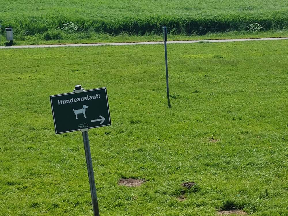 Schöne Hundewiese, doch keine Kotbeutel und kein Zugang zum Wasser. Fahrradwege nicht abgetrennt