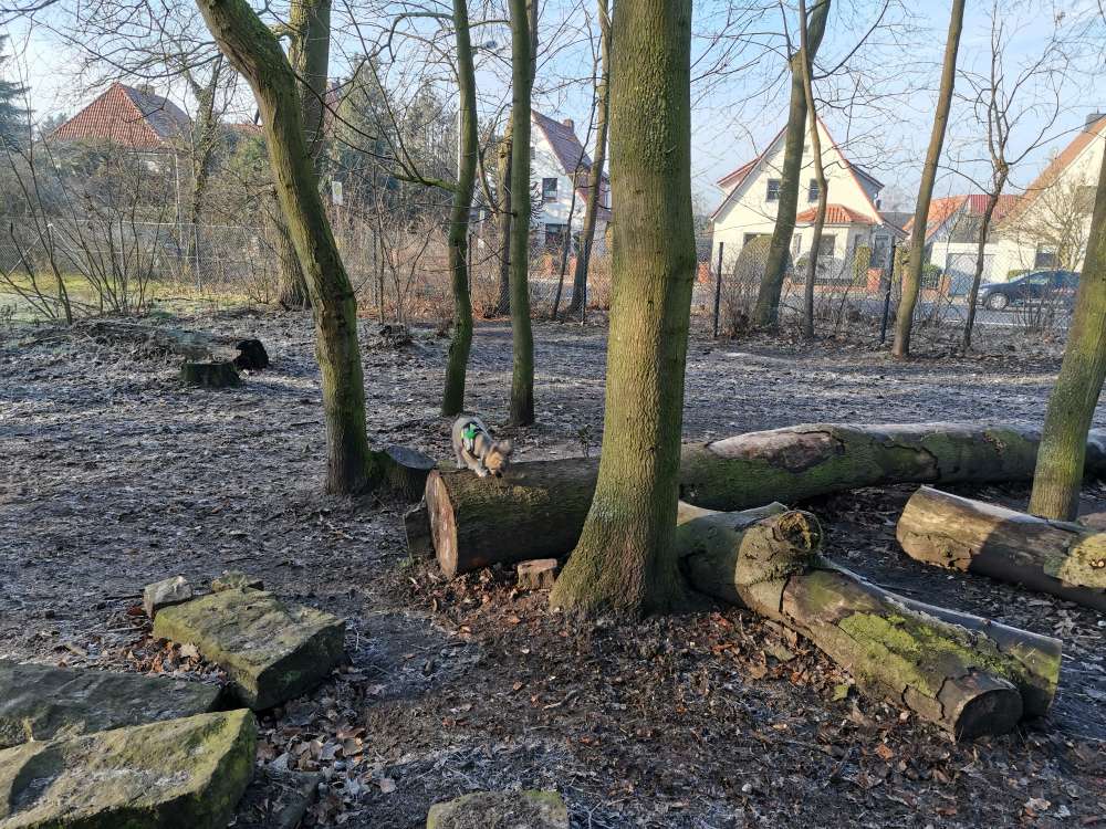 Die Hundefreilauffläche ist schön großzügig und gleichzeitig so gestaltet das der eigene Hund immer sichtbar ist. Es gibt Baumstämme und größere Felsen auf den die Hunde balancieren können. Grasflächen sind vorhanden und auch ein Mülleimer für den Hundekot. Zum Verweilen laden ein paar Bänke ein. Ansich total klasse.