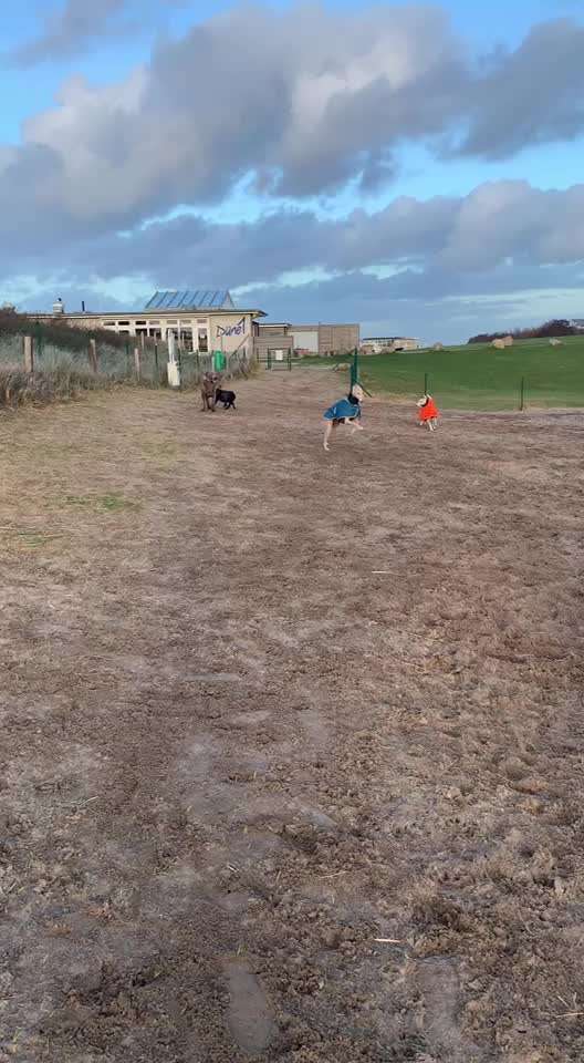 Hier können unsere 4 beinigen Lieblinge ohne Leine toben und wir 2 Beiner können zusammen schnacken und uns erfreuen. Wiese ist eingezäunt.