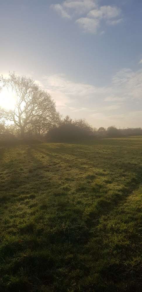 Große Obstbaumwiesen, lange Feldwege und ein kleiner Wald.