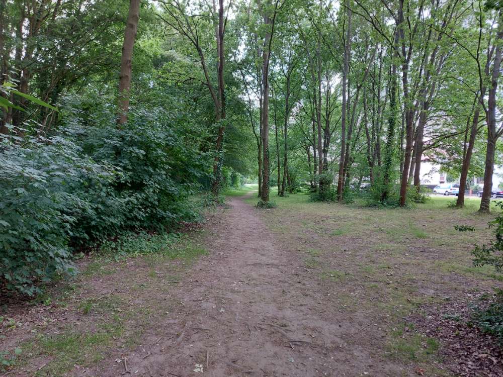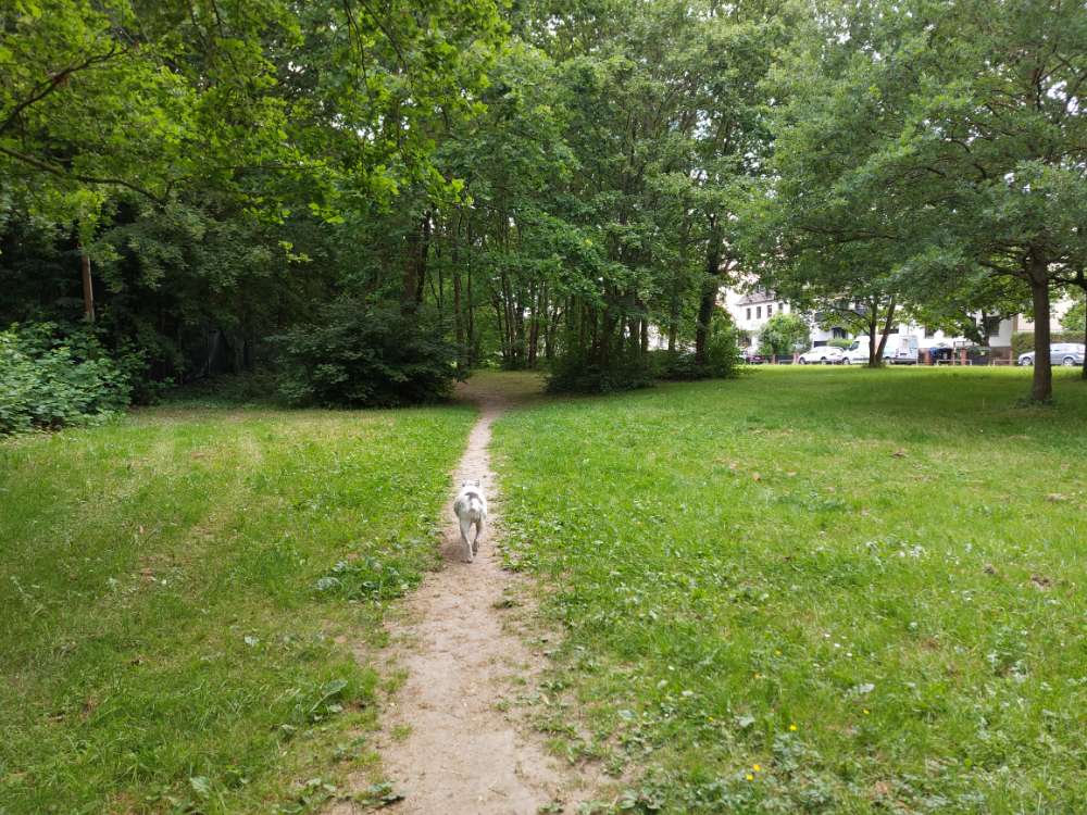 Leider direkt an der Straße ohne Zaun und an einem Fußweg, der als Fahrradrennstrecke genutzt wird..... Sehr kleine Wiese. Aber von da aus kann man zwischen Kleingärten spazieren gehen