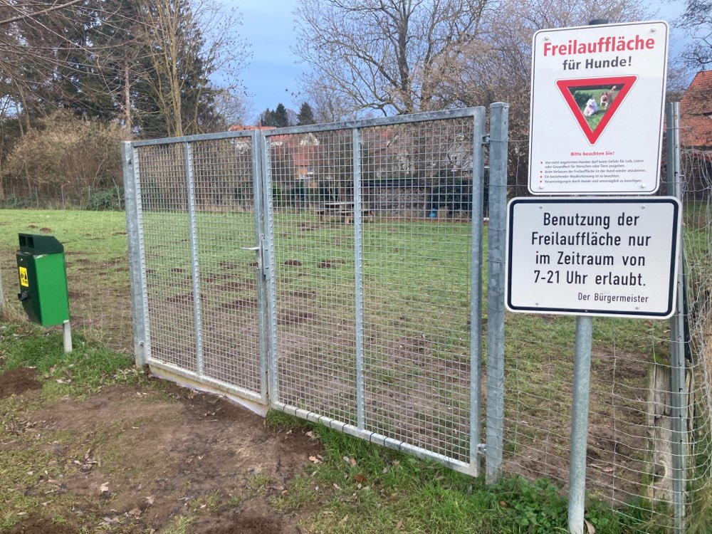Schöne auslauffläche, finde ich gut das der Zaun vernünftig hoch ist, gute Sitz Möglichkeiten, Kotbeutel Spender + Mülleimer vor der Tür, Wiese war auch frei von Haufen