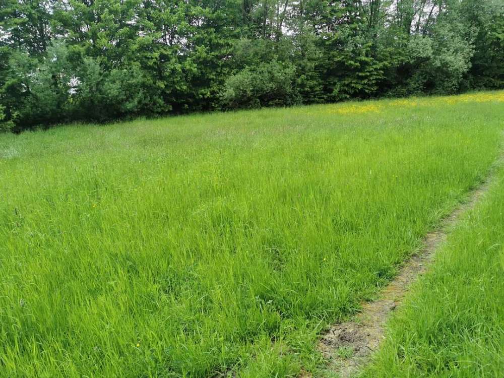 Eine naturbelassene Wiese mit Feldweg und Bach mit Zugang nebenan.