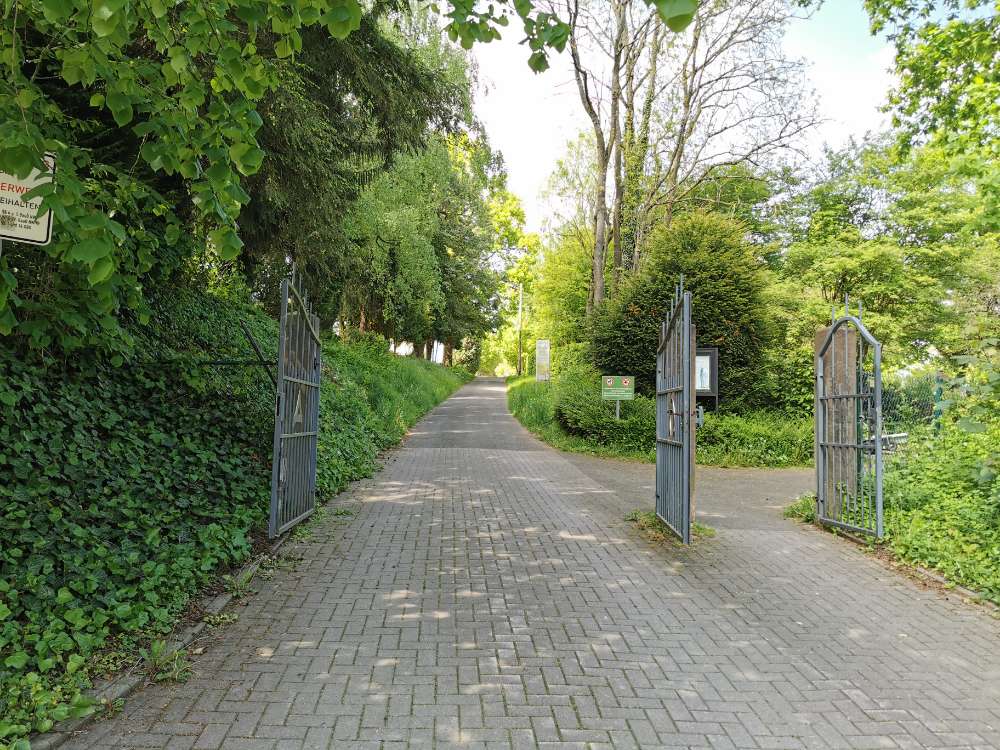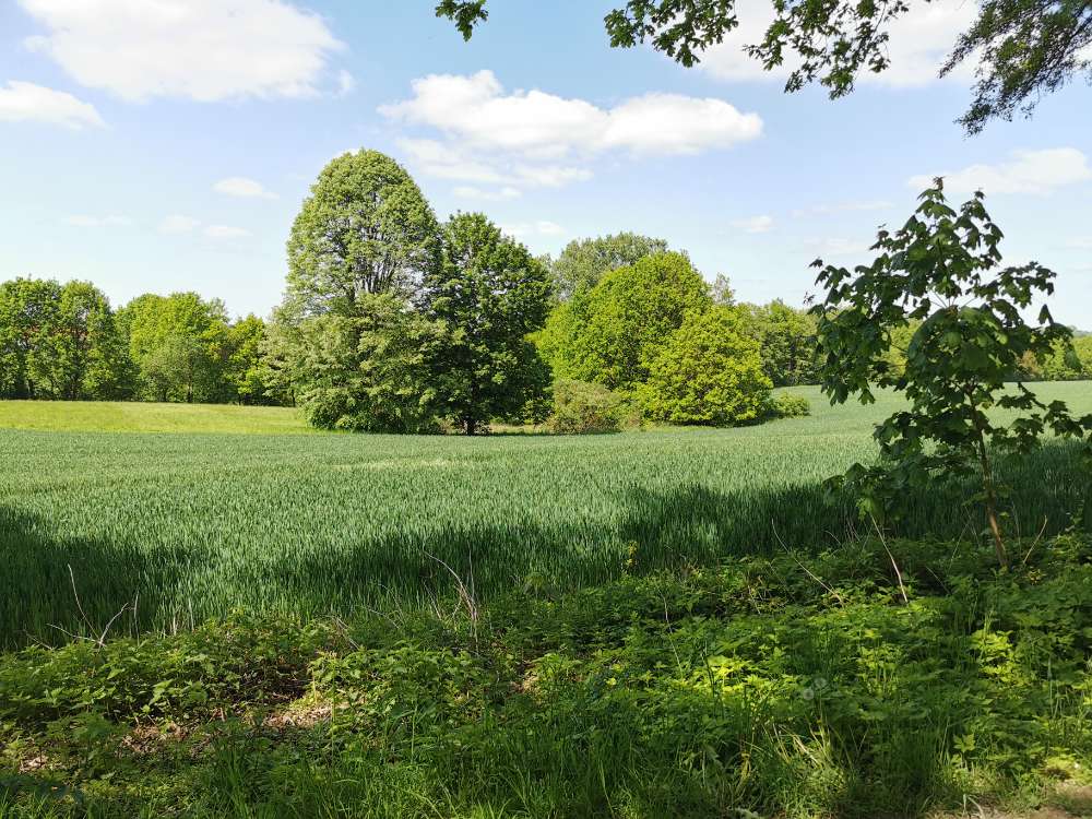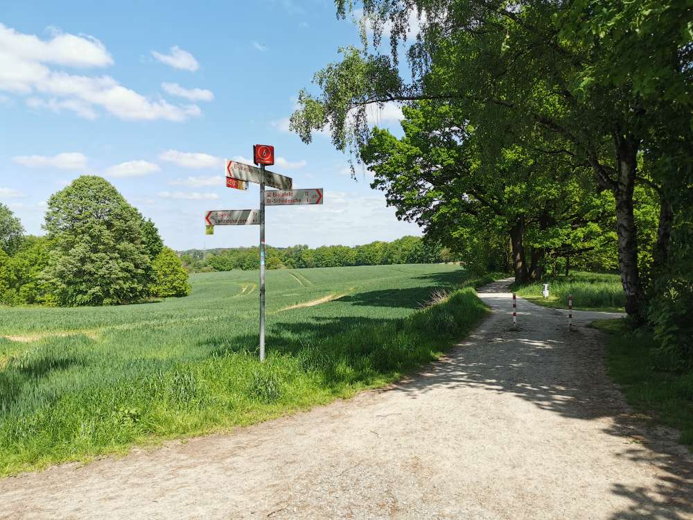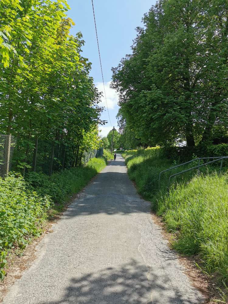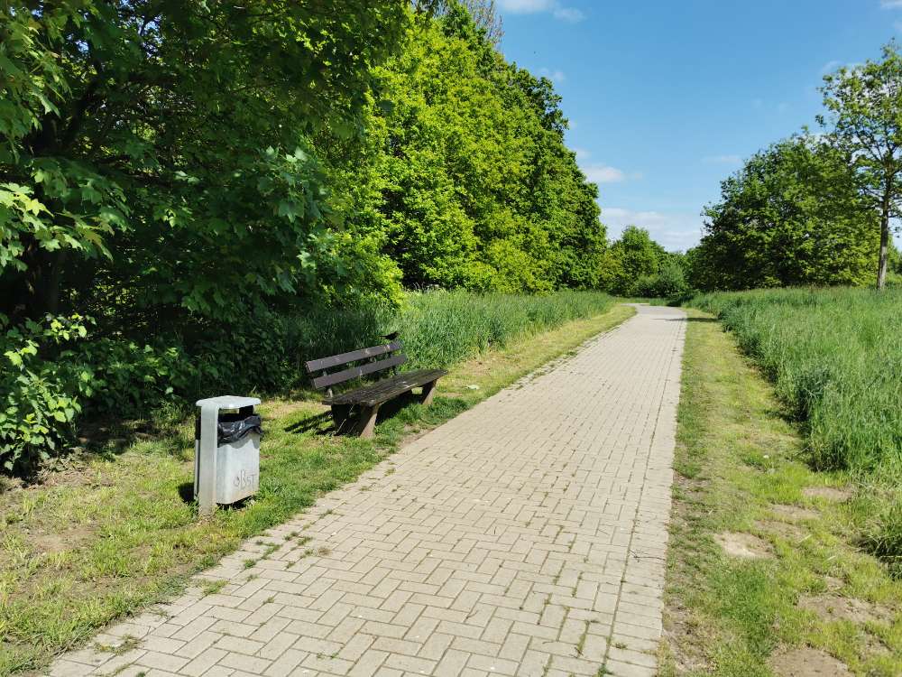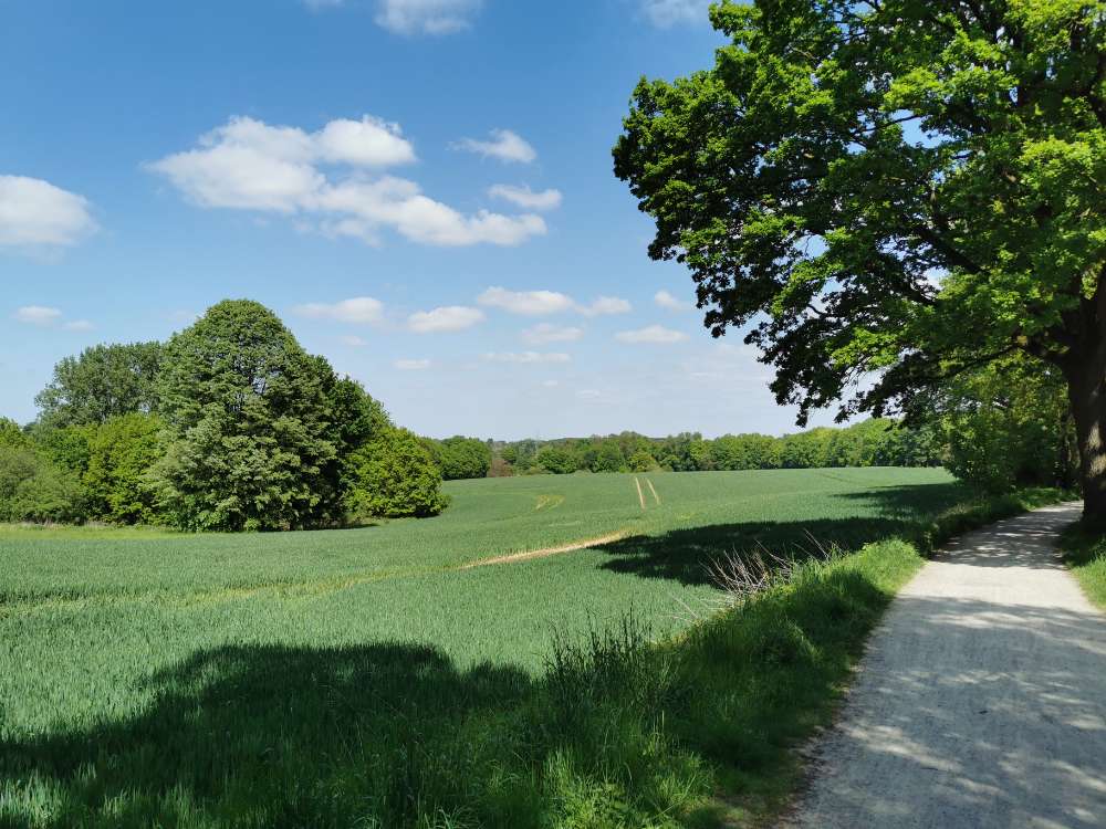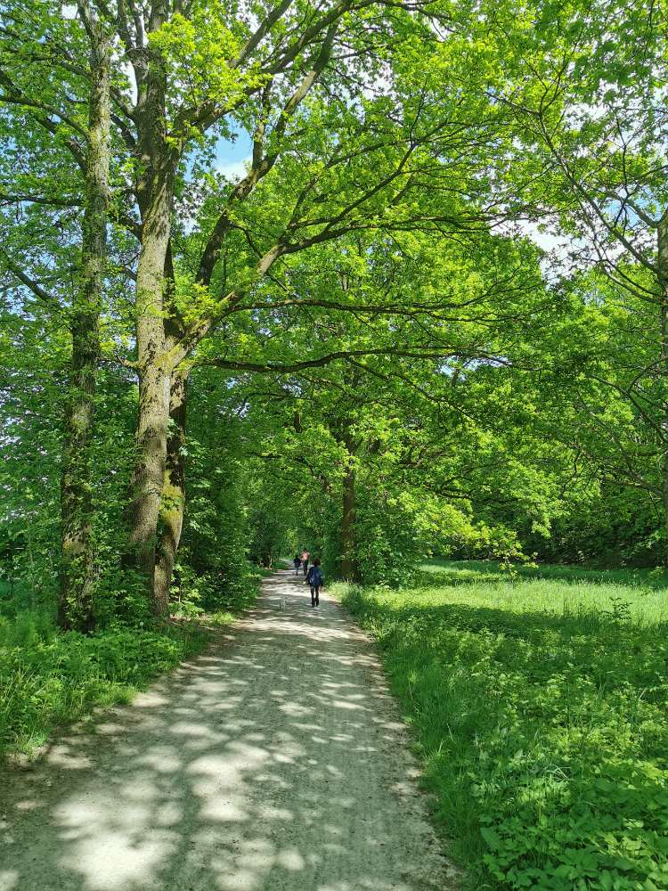 Hinter dem Friedhof in Jöllenbeck, am alten Bahndamm, befindet sich ein Weg im Grünen, der Richtung Enger führt. Dort kann man super zwischen den Feldern im Schatten der Bäume mit dem Hund spazieren gehen. Man trifft dort oft auf andere Hunde, Fahrradfahrer:innen und Spaziergänger:innen.