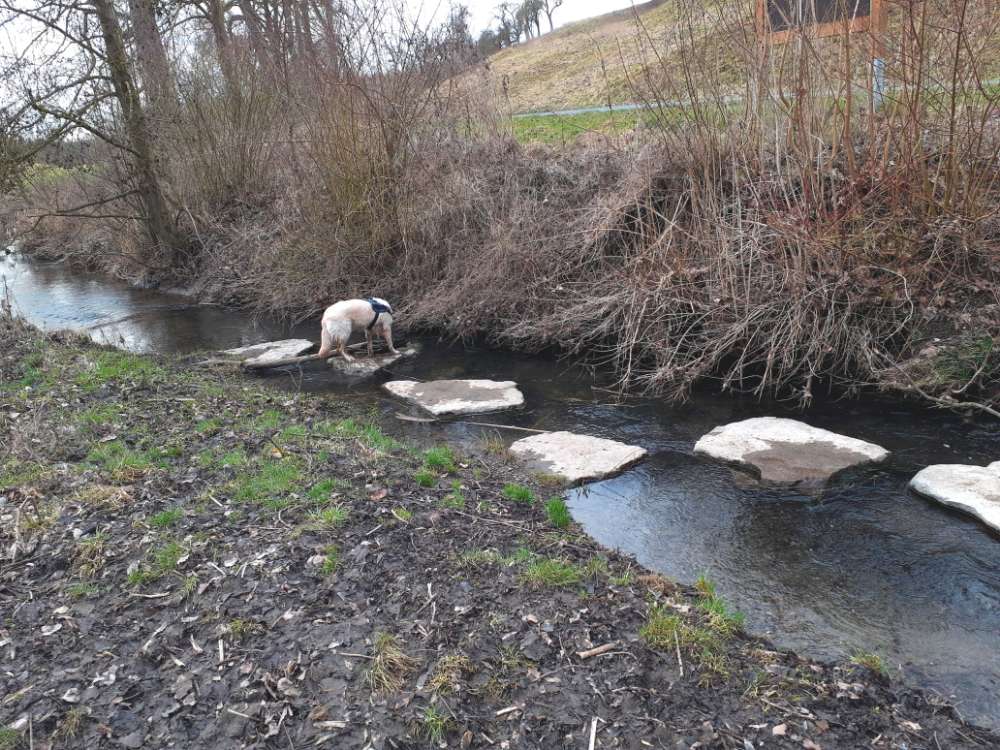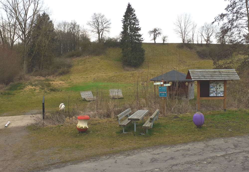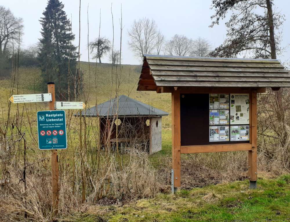 Pavillion mit Sitzmöglichkeiten am Bach und großer Wiese. Direkt am Rundwanderwege B2.
