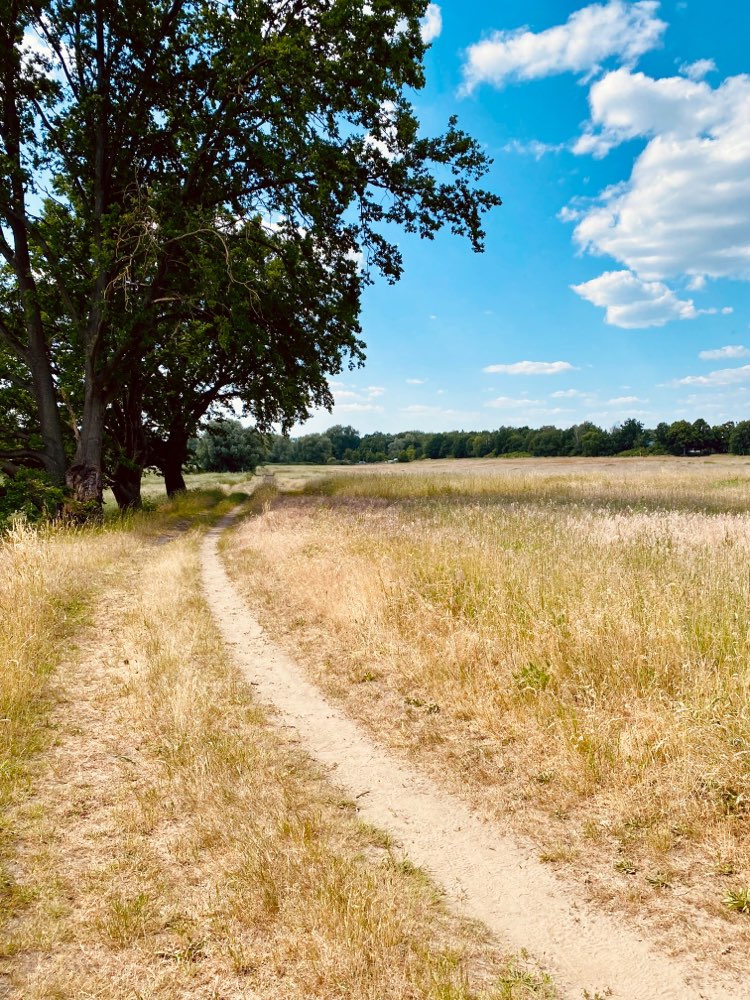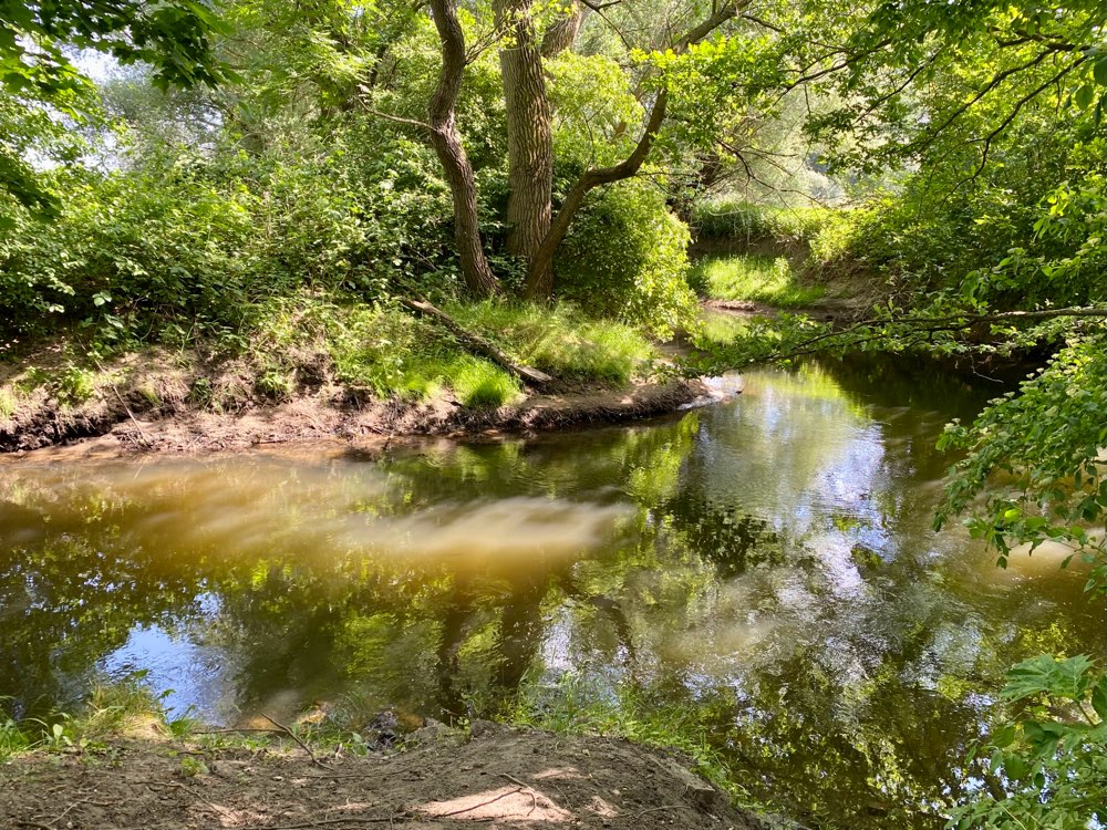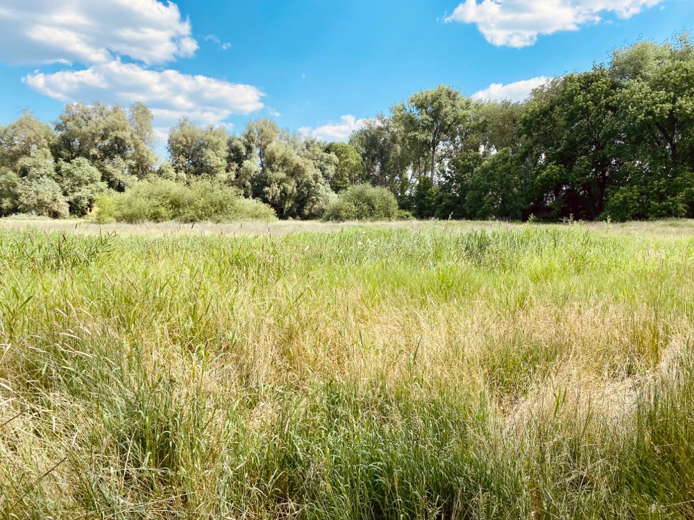 Schönes Auengelände (Landschaftsschutzgebiet) mit Schattenplätzen und Bänken. Eher im Frühjahr geeignet, da im Sommer das hohe Gras die Wege teilweise schlecht begehbar macht und viele Grannen danach eine gute Kontrolle des Hundes notwendig machen. An einem Wegabschnitt steht Riesen-Bärenklau (der Saft führt in Verbindung mit Licht zu Verbrennungen), der aber zum Glück nicht den ganzen Weg blockiert. Am Friedhof sind schattige Parkplätze vorhanden.