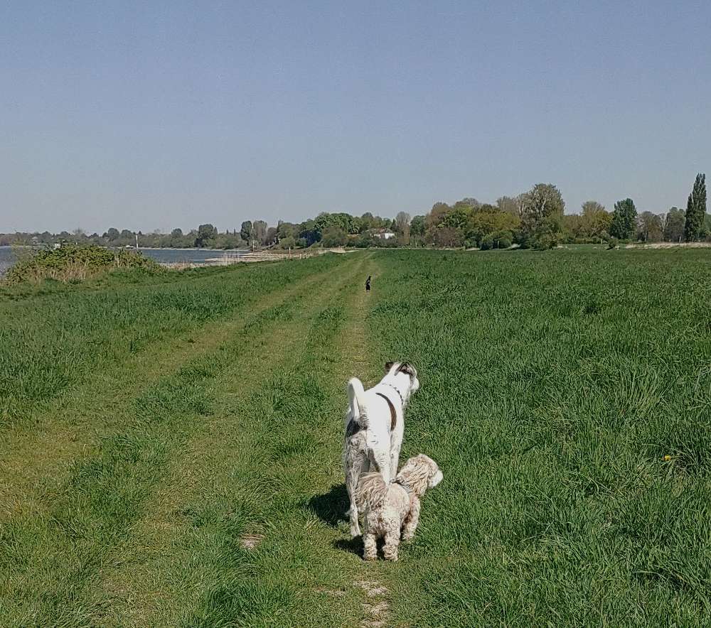 Hinter dem Anleger der Fähre zwischen Kaiserswerth und Meerbusch in den Rheinauen sind immer zahlreiche Hunde unterwegs, meist ohne Leine, so dass sich oft tolle Spielmöglichkeiten ergeben.