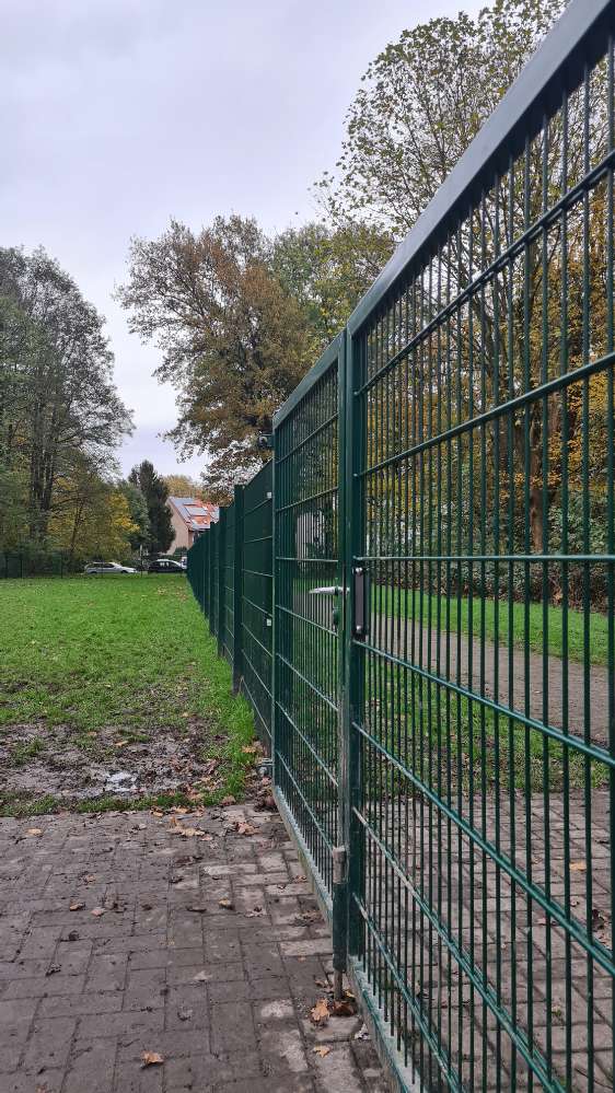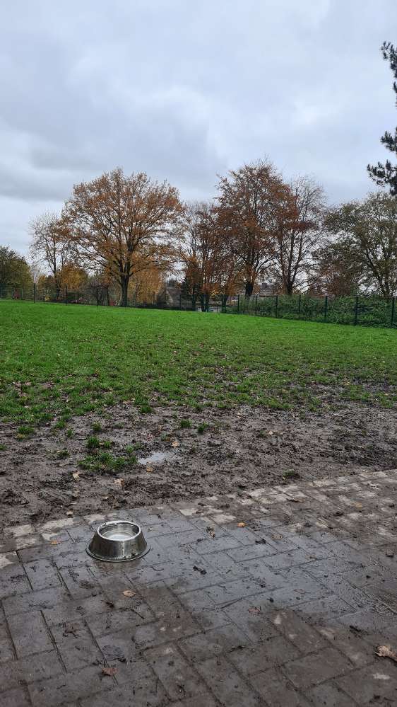 Eingezäunter Bereich mit Bank und Mülleimer. Kleines Stück gepflastert da es oft sehr matschig wird bei Regen. Hier und da ein paar Löcher im Boden die ggf etwas gefährlich werden können.