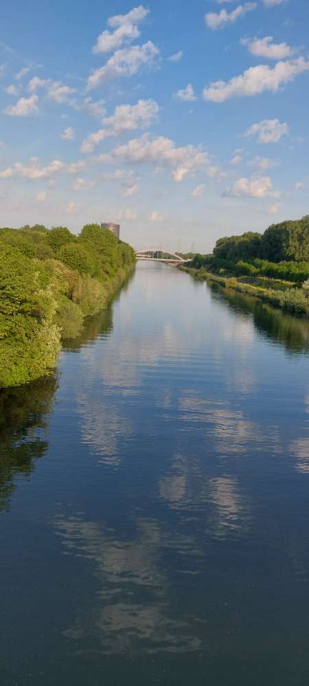Hier muss der Hund zwar eine Leine haben, aber man kann eine große Runde entlang des Rhein-Herne-Kanals spazieren und kommt auch am Zauberlehrling vorbei👍
