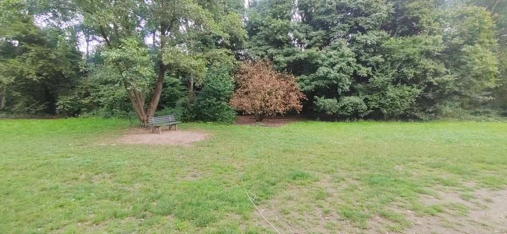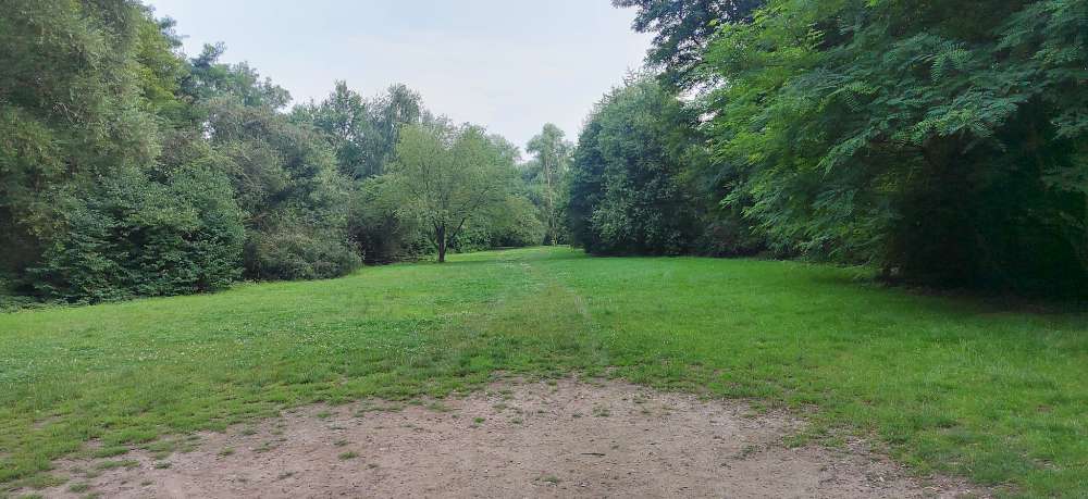 Eine schöne große Wiese, auf der die Hunde rennen und spielen können. Das Gelände ist nicht eingezäunt aber ringsrum von Bäumen und Büschen umgeben.