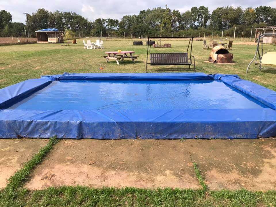 Mit einem selbst gebauten Pool mit drei Abstufungen für unterschiedlich große Hunde. Mega schön da.