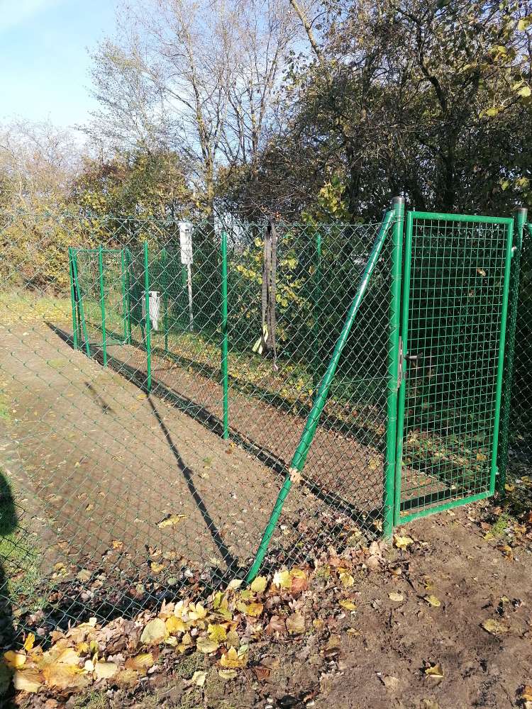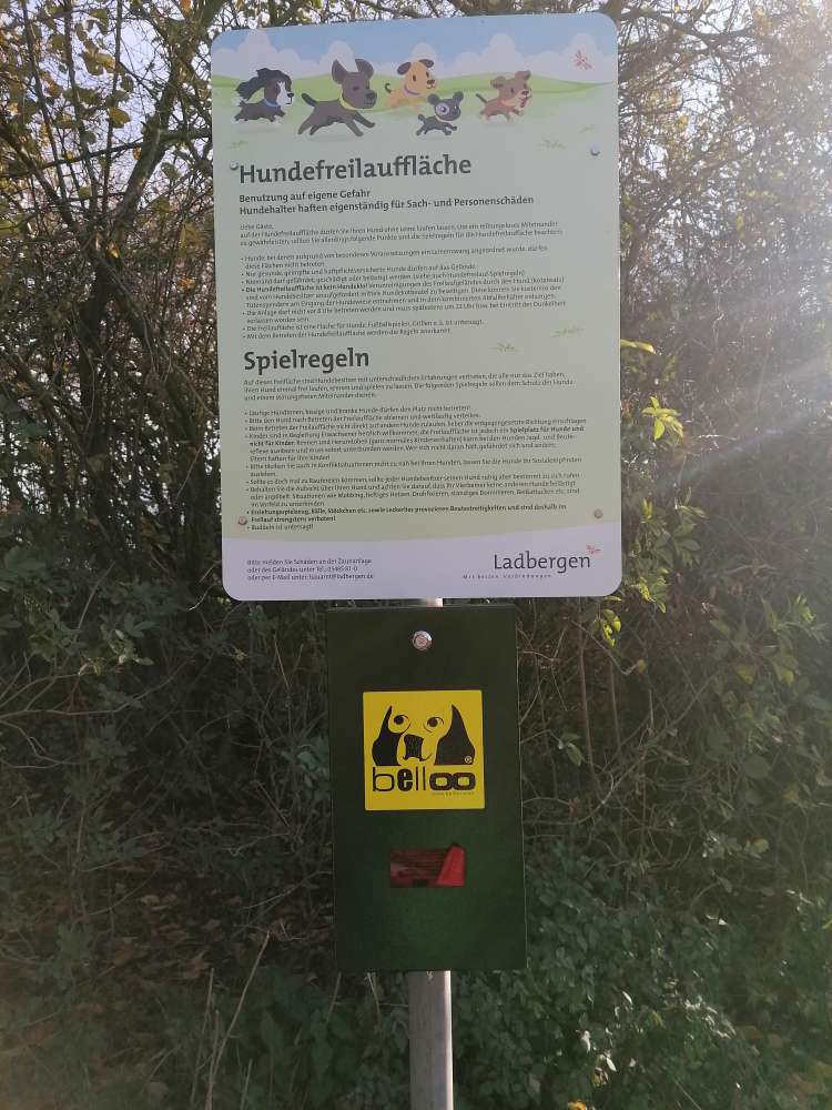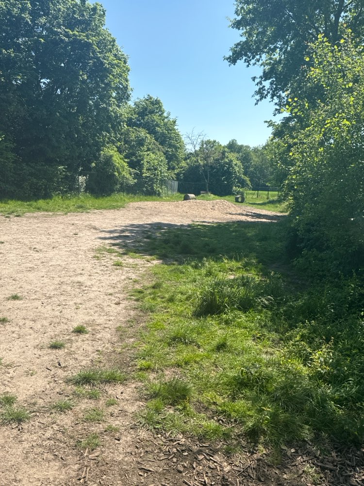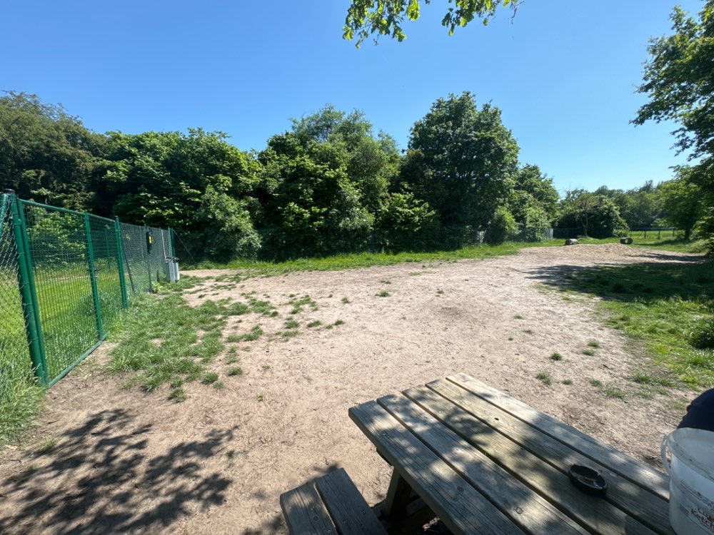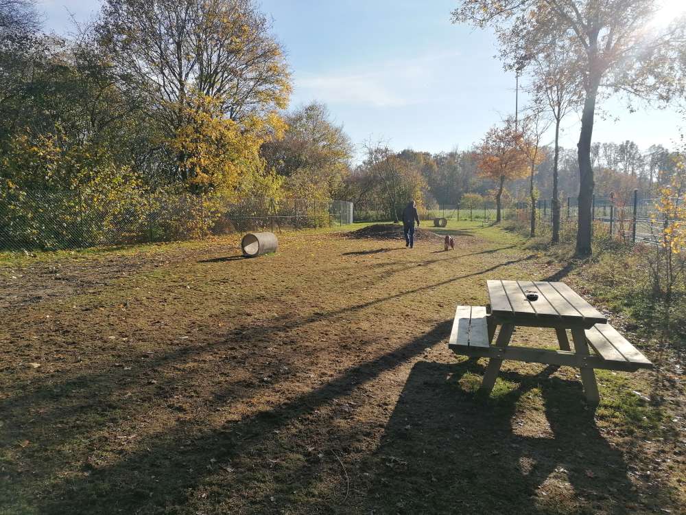 Wir sind voll zufrieden! Es ist eine Hundewiese, eingezäunt. Es steht eine Bank, ein Aschenbecher und Hundebeutel für die Besitzer bereit, für die Hunde ein Sandhaufen, Tunnel und Wasser.