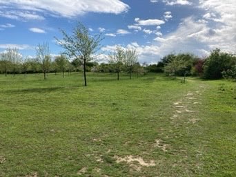 Schöne, große Obstbaumwiesen, ein Teich und viele Wege für Jogger, Radfahrer und Spaziergänger mit und ohne Hund. Eine Kombination aus Wiese, Feld und versteckten, schmalen Wegen an der Ziegelei. Wer aufpasst, kann an den Brombeerbüschen naschen. Es gibt einen gut versteckten Bikepark und einen kleinen Parkplatz 🚗 . Rundum schönes Gebiet, beschränkt letztlich durch Autobahn und Schnellstraße.