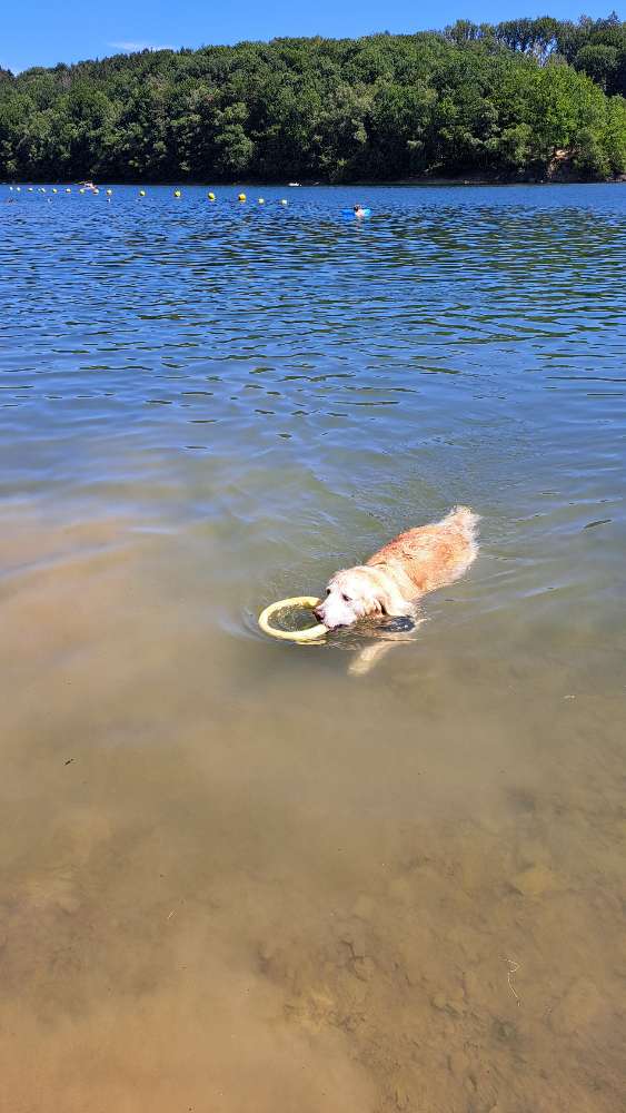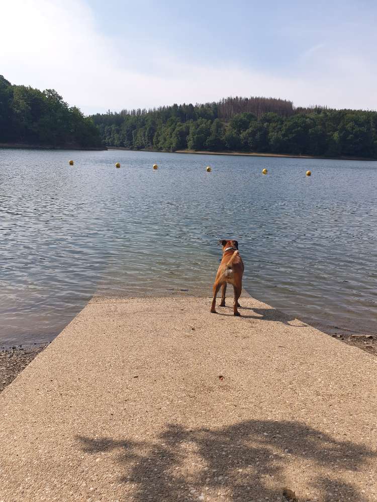 Ich empfehle zwischen Kiosk (DLRG-Station) und Jugendherberge "Glörsee" mit Hund ins Wasser zu gehen.
