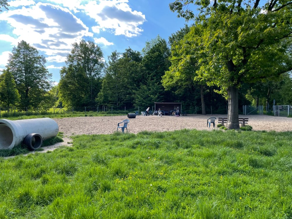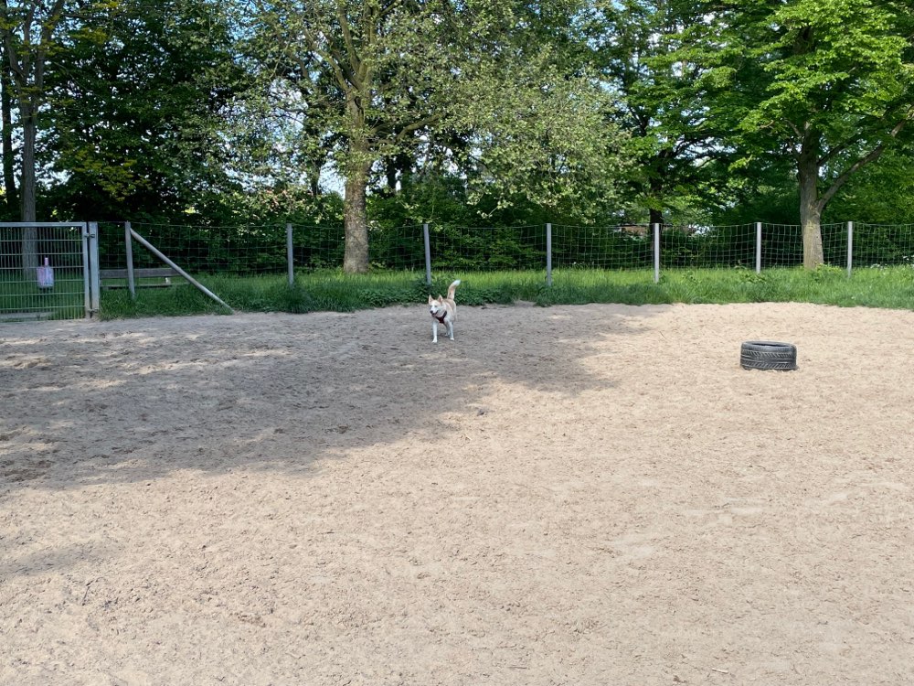Richtig tolle Hundewiese mit einer Eingangsschleuse und ausreichend Platz zum toben für die Fellnasen. Mülleimer und Kotbeutelspender sind genauso vorhanden wie Sitzmöglichkeiten für Herrchen und Frauchen. Ein überdachter Unterstand schützt vor Sonne und Regen.