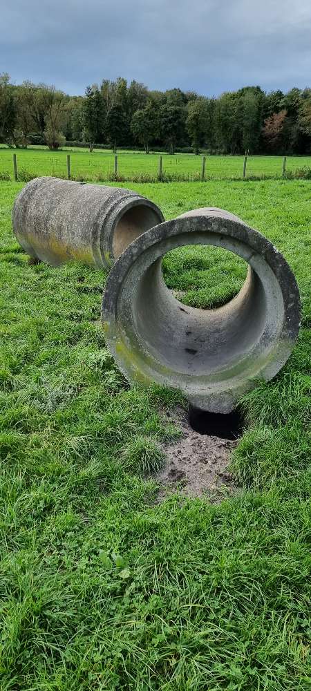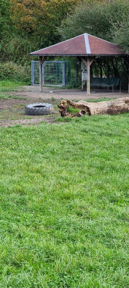 Sie ist sehr klein, die Haufen werden hier nicht immer entfernt, Löcher bleiben, aber es gibt einen überdachten Sitzplatz. Sie ist auch nicht hoch eingezäunt, normaler Schafszaun. Am Eingang ist eine Schleuse, auf der Wiese liegen Betonröhren und 1 Baumstamm.