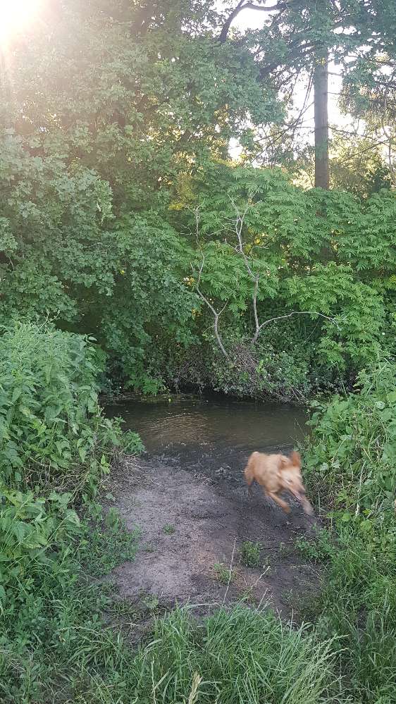 Super Hundewiese mit Bademöglichkeit im Bach. Aus der Offenbacher Innenstadt ist man in 10 Minuten mit der Bahn dort und es gibt Parkmöglichkeiten.