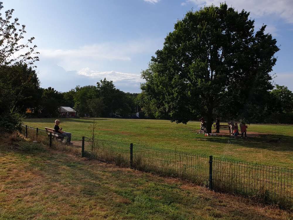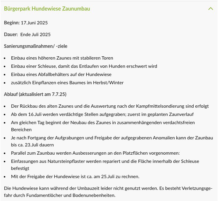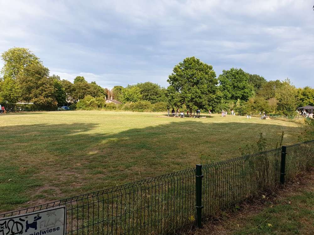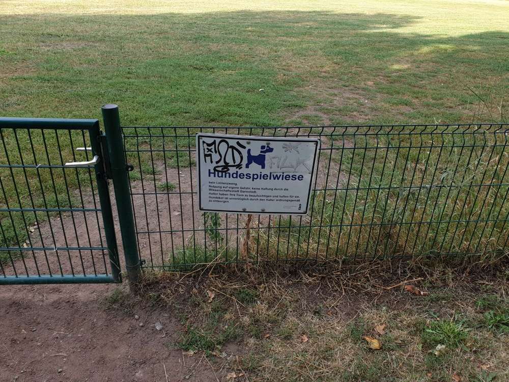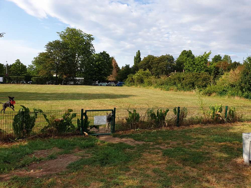 Tolle große Hundewiese, die bei unseren Hunden sehr beliebt ist, mittlerweile hat sich eine richtig schöne Hund/Mensch-Gruppe gebildet und es haben nicht nur die Vierbeiner ihren Spaß, sondern auch die Zweibeiner können tolle Gespräche führen. Es wurden dieses Jahr 4 weitere Bänke aufgebaut und eine Sandgrube zum buddeln angelegt. Der Viel zu niedrige Zaun soll spätestens im nächsten Frühjahr erhöht werden. Auch soll mindestens ein Törchen eine Schleuse bekommen, damit das reinkommen etwas entspannter wird.