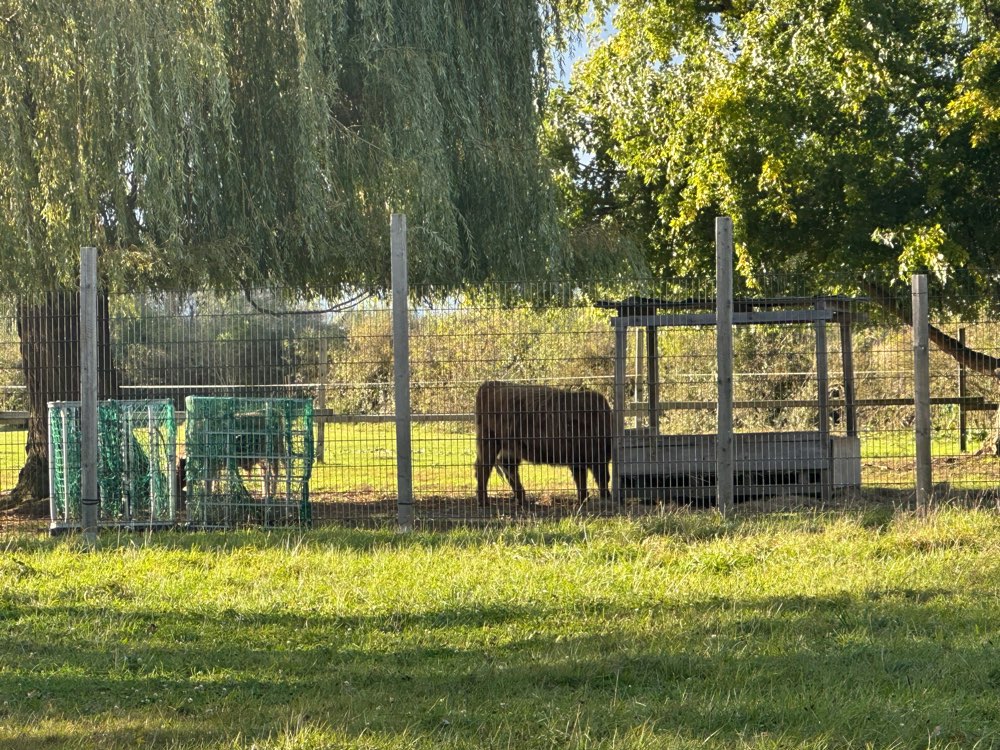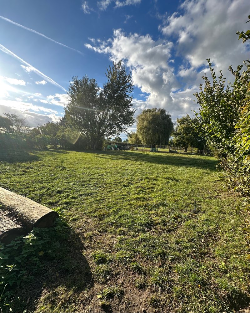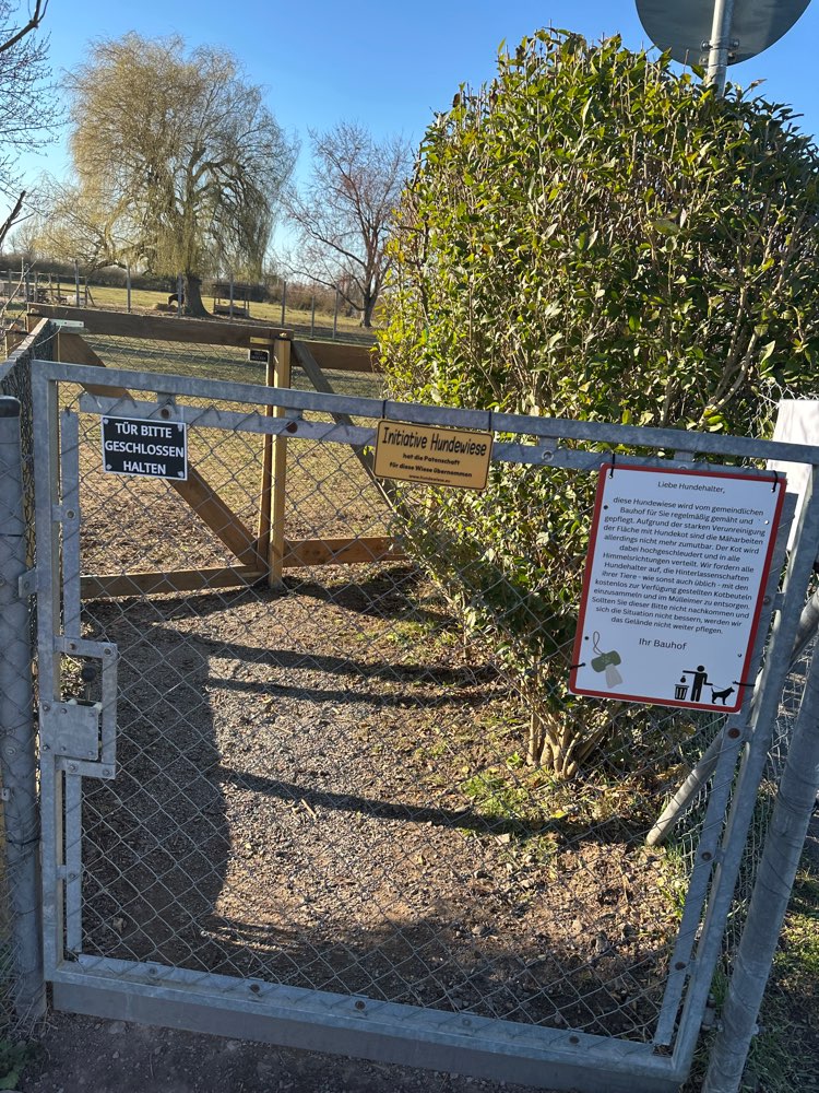 Eingezäunte Hundewiese in der Nähe des Parkplatzes am Altheimer Bahnhof… liegt direkt am Rad-/Fußgängerweg Altheimer Straße… es stehen andere Tiere nebenan auf der Fläche… aber die Wiese selbst ist eingezäunt. Kotbeutelspender und ein paar wenige Sitzmöglichkeiten vorhanden