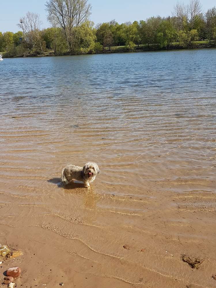 Natürlicher Sandstrand mit einigen Steinen zum Schutz gegen Abtragung des Sandes durch den Wellenschlag der Schiffe. Mülleimer am Zugang vorhanden, wird regelmäßig 1x /Woche wie alle Mülleimer von der Stadt geleert. Auf der Sandbank kann man weit in den Fluß hineinlaufen. Vorsichtig vor dem Sog vorbeifahrenden Schiffe!!! Das Wasser erscheint sehr sauber und klar und wird im Sommer angenehm warm. Deshalb nicht nur Badestelle für Hunde, sondern auch für Hundehalter. Ich bin im Sommer mit meinen 2 Hunden regelmäßig dort und habe noch nie Hundekot entdeckt, dafür jede Menge Zigarettenkippen. Am Wochenenden in den Sommerferien ziemlich überlaufen, wochentags wesentlich weniger frequentiert. Anfallender Müll wird fast ausnahmslos ordentlich am/im Mülleimer am Zugang abgelegt. Gelegentlich sind auch 2 oder 3 Reiter aus den nahegelegenen Reiterhöfen mit ihren Pferden dort. Vormittags vollsonnig gelegen, ab 13 Uhr im Schatten. Achtung!!! Die Bäume im Auwäldchen und in Abgrenzung zum ufernahen Radweg sind morsch und brüchig.
