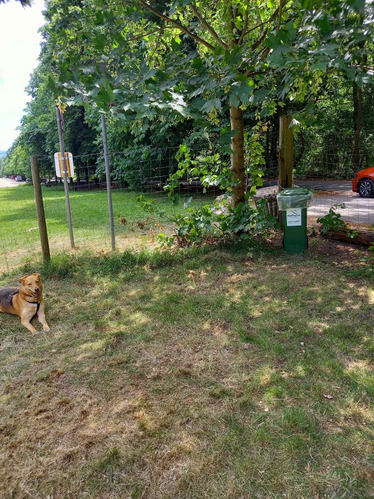 Ein Mülleimer für Häufchen ist vorhanden, darüber ein Spendermit Beuteln.