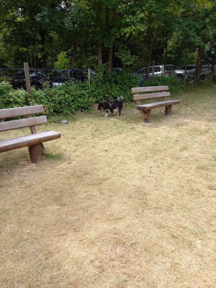 Tütenspender, Mülleimer, Sitzbänke. Besonders die Baumstämme sind eine tolle Idee zum Klettern und Toben. Nicht aufgesammelte Kackhaufen und im Sommer eigentlich zu sonnig und für die Anzahl der Hunde zu klein.