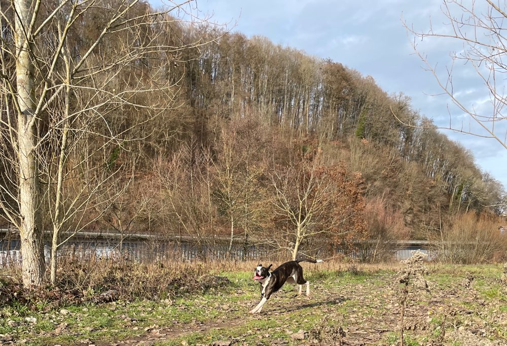 Hunde können dort frei laufen, die Wiese ist auf der einen Seite durch die Saar und auf der anderen Seite durch Hecken, Sträucher und Bäume begrenzt. Ein fester Zaun ist nicht vorhanden.