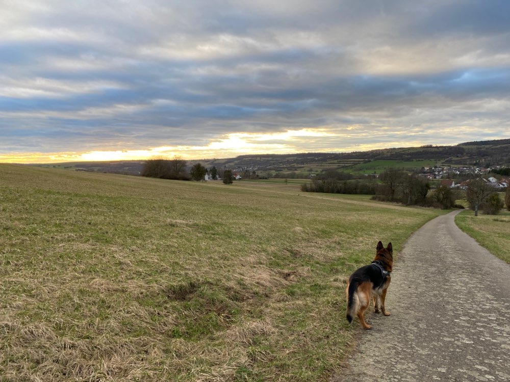 Schöne Wiese, man kann auch hoch in den Wald (Naturschutzgebiet) und laufen bis nach Medelsheim.