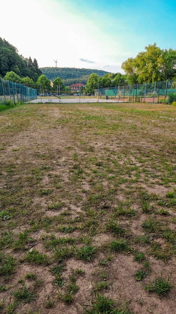 Die eingezäunte Hundewiese ist neben dem Tennis- und Volleyballplatz. Mülleimer vorhanden.