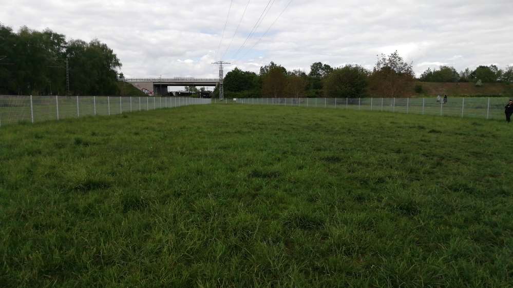 Sehr große Wiese in zwei Bereiche eingeteilt mit Schleuse am Eingang. Bahnschienen mit Ice Verkehr recht nah. Sitzmöglichkeiten wenig. Auf jeder Seite Betonblock mit je 3 Gittersitze. Man muss ein Stück ins Feld laufen ca. 200 m. Wir sind dort gerne da man dort immer jemanden antrifft beste Zeit Samstag und Sonntags ab 14 Uhr.