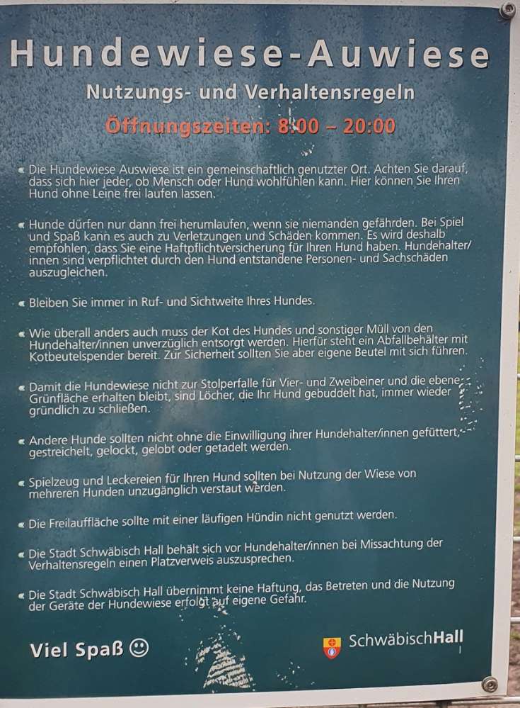 Allgemeine Informationen: Der erste Hundepark Schwäbisch Halls befindet sich am Rand der Auwiese, zwischen Optima Stadion und Kocher. Er umfasst eine Fläche von 90 auf 25 Meter. 12.000 Euro hat das gekostet. Die Stadtverwaltung hat das meiste Geld für den knapp zwei Meter hohen Zaun und das massive Tor ausgegeben. Es wird darum gebeten Hinterlassenschaften der Hunde eigenverantwortlich zu entfernen.