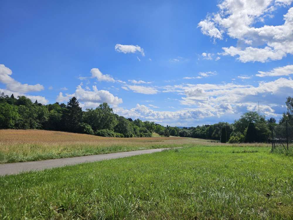 Schöner Weg in Birkenfeld mit viel Grün und Feldern