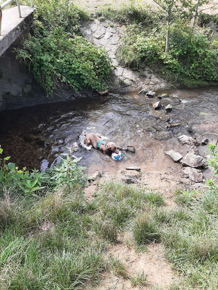 Hier konnten wir Benny unbekümmert frei laufen lassen und auch mit ihm Ball spielen. Die Abkühlung konnte er sich direkt aus dem Bach holen.