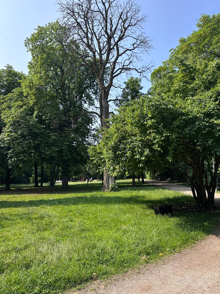 Hinterer Teil des Kroneparks ohne grüne Poller, Hunde können ohne Leine auf einer Wiese laufen. Allerdings häufig Spaziergänger unterwegs