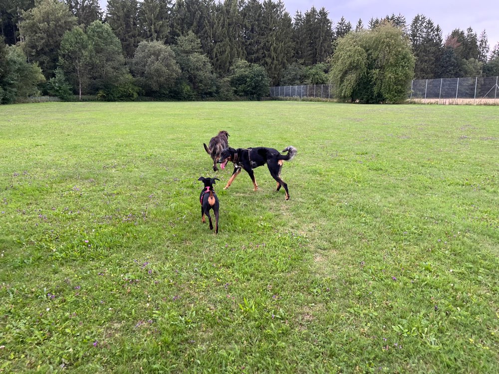 Die grüne Wiese ist bis auf ein und Ausgang fast durchgehend eingezäunt. Daneben gibt es ein riesen Feld wo ausenrum gelaufen werden kann. Man kann jederzeit in den forstenrieder Park wechseln und durch den Wald laufen. Hier ist aber leinen Pflicht Parkplatz direkt vor der Schule